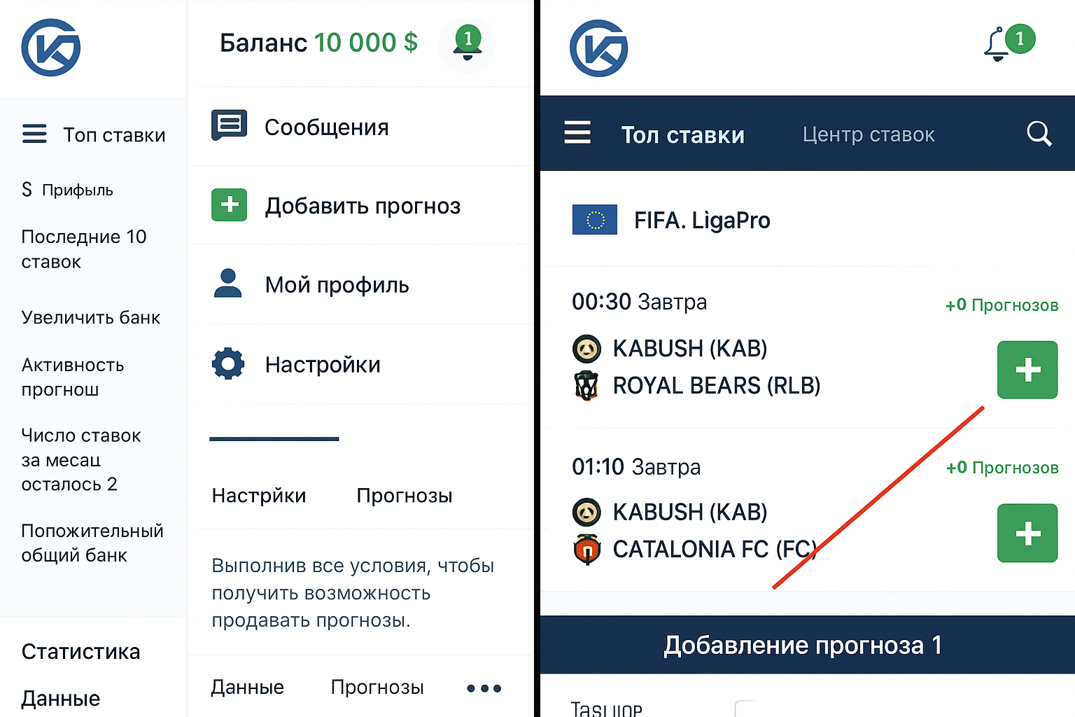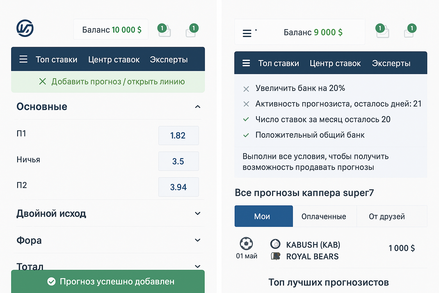 После короткой регистрации вы получаете кабинет с уже начисленными «учебными» деньгами — это аналог демо‑режима у БК. Авторские прогнозы можно выкладывать самостоятельно или покупать чужие; по итогам месяца лидерборды формируют победителей, которые получают реальные призы.