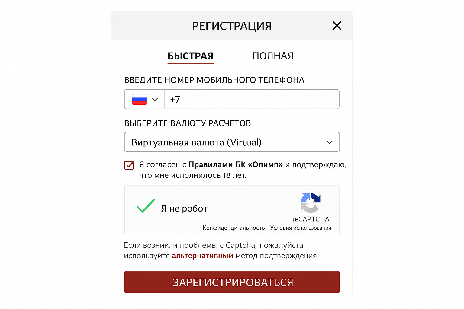 Олимп: тест без риска. Здесь подойдет укороченная регистрация; при создании профиля выберите вариант с «виртуальной валютой». На указанный номер придет пара логин/пароль для входа на сайт.
