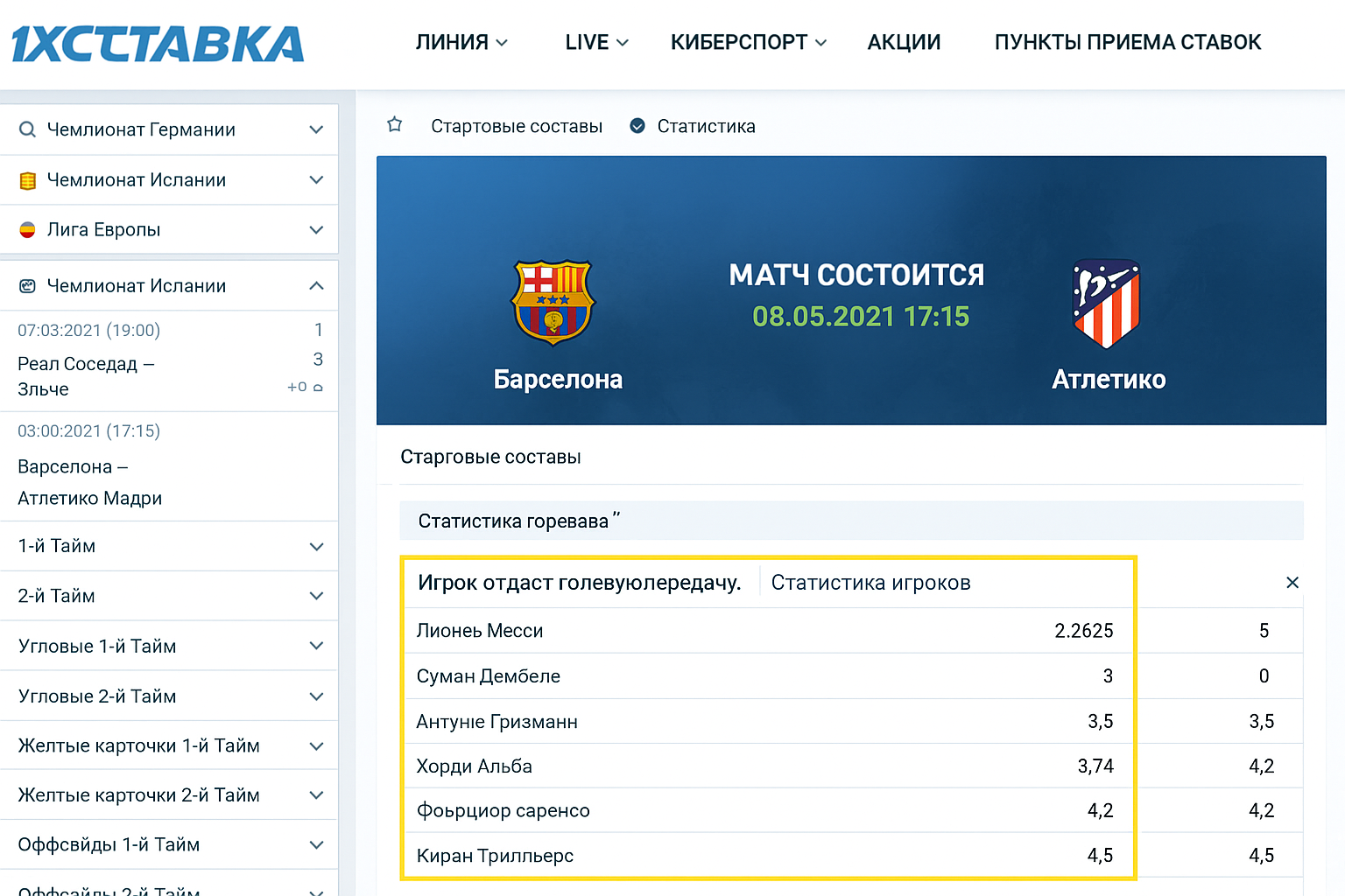 - Ассист в рамках встречи — игрок: варианты исходов «да/нет». Учитывается только основная часть поединка; если пас под гол случился в экстра-тайме, такой эпизод не входит в расчёт.