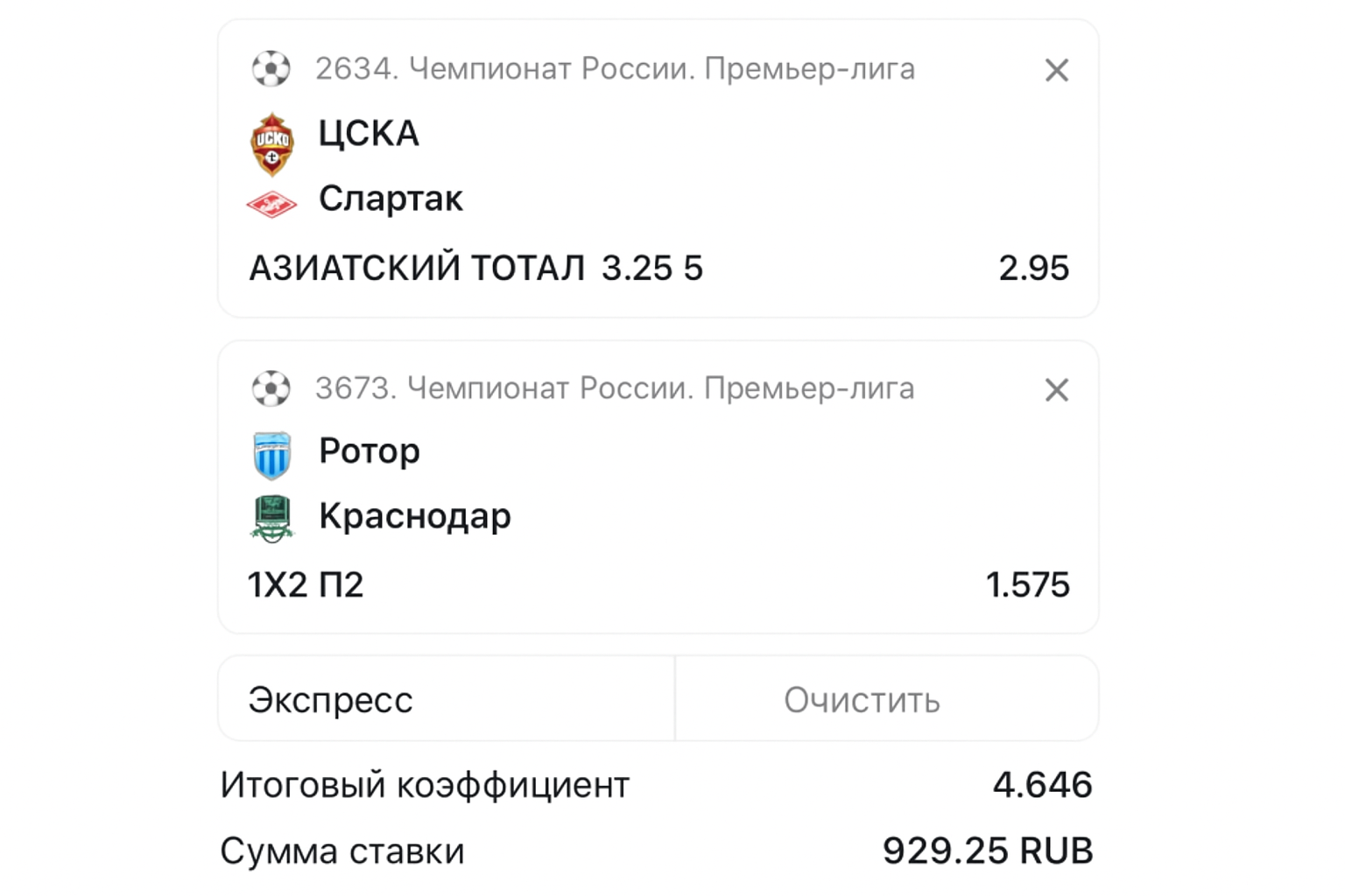 Пусть «Краснодар» обыгрывает «Ротор», и остается только азиатский тотал больше 3.25 в игре ЦСКА — «Спартак». Возможные расчеты: