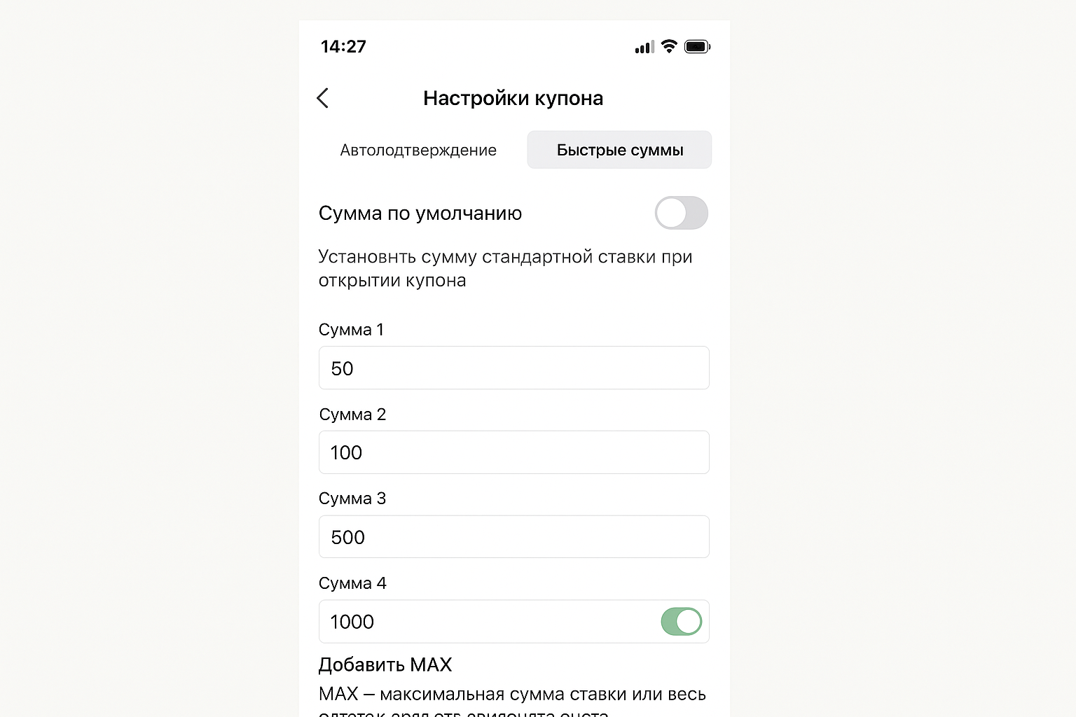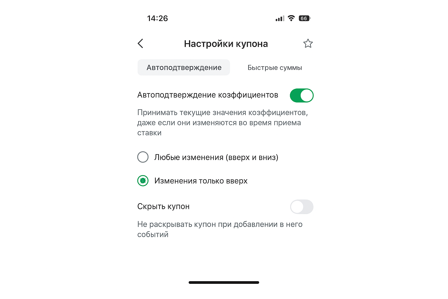 Чтобы сократить путь клика, в «Купоне ставки» задаются четыре предустановленные суммы; после сохранения их достаточно выбирать одним нажатием. При желании включается автопринятие обновлённых коэффициентов — система согласует ставку даже при движении линии.