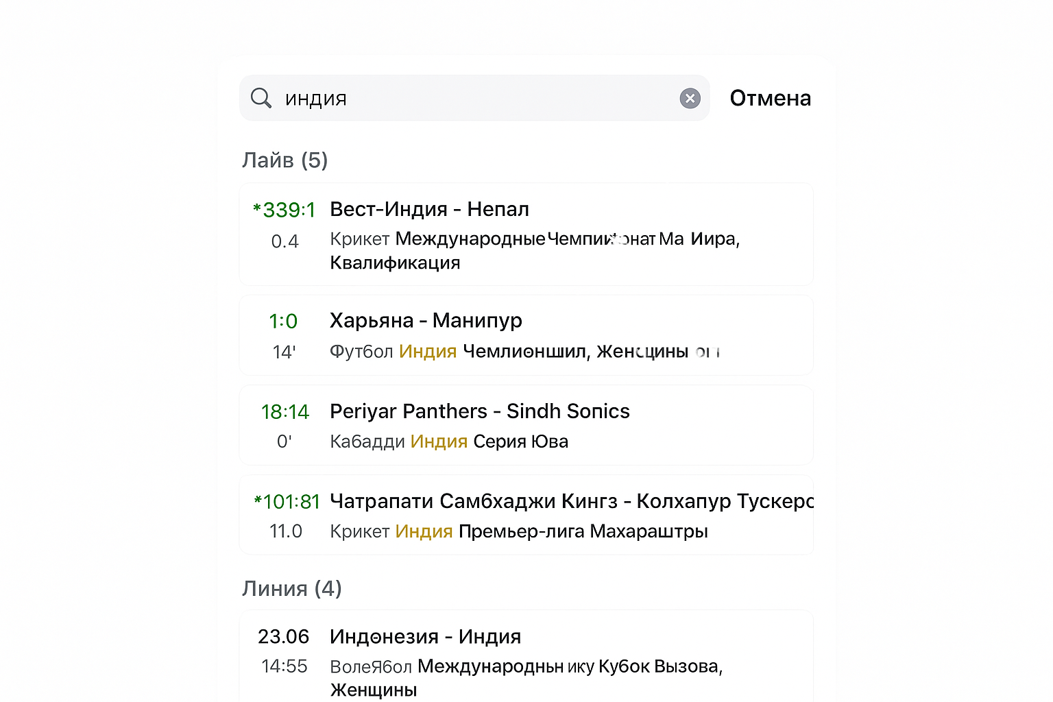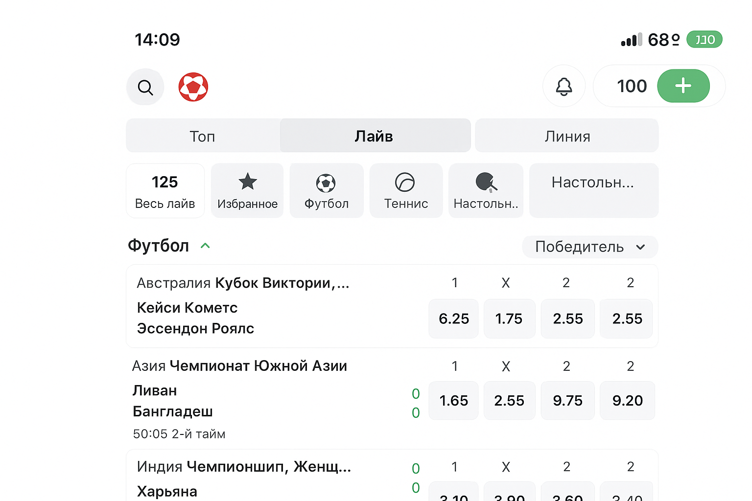 Чаще других на экране появляются самые посещаемые дисциплины — футбол, баскетбол, хоккей. Периодически добавляют предложения по киберспорту, бадминтону, настольному теннису; такие рынки поддерживают лайв-скор и быстрые исходы.