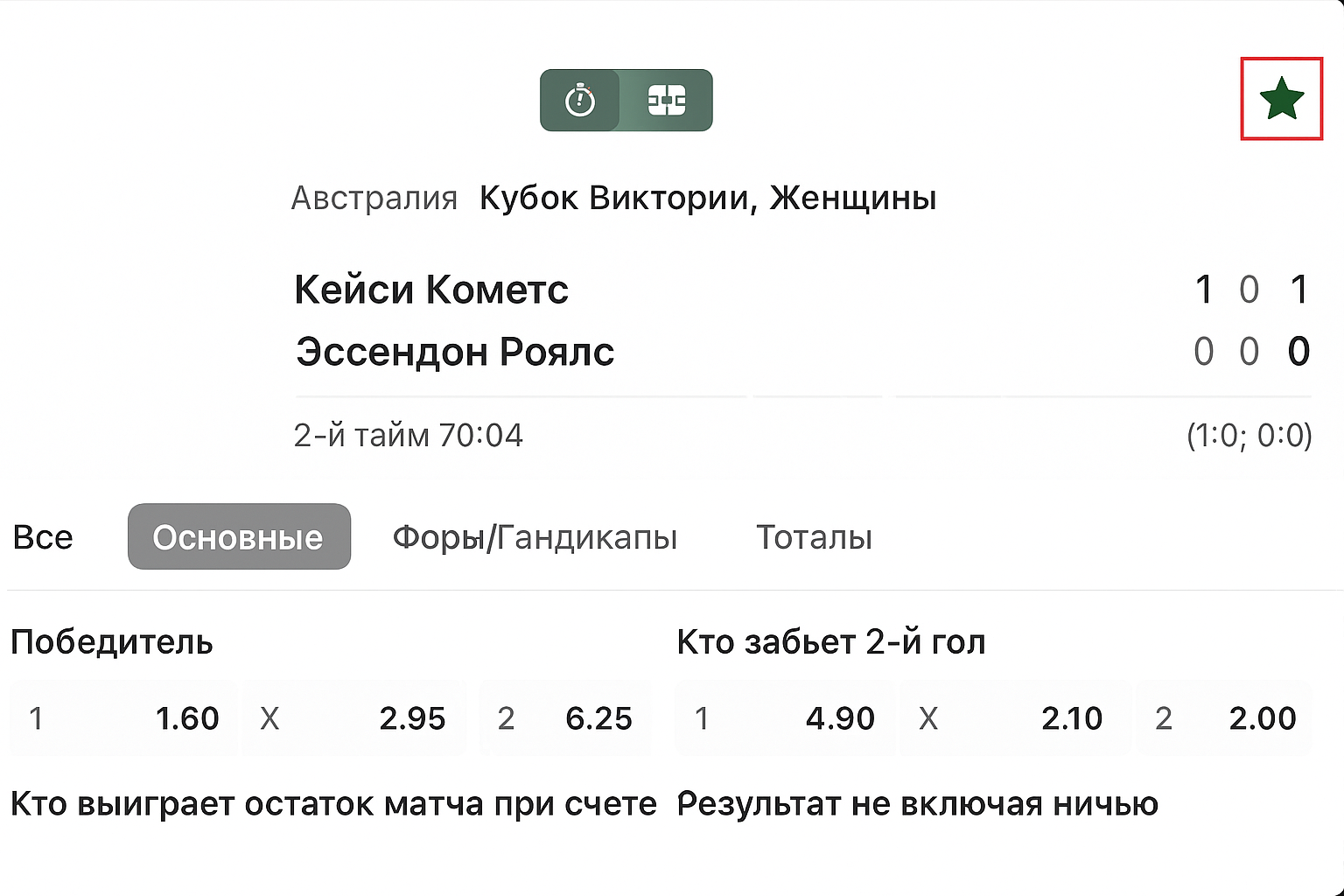 Для поиска удобнее менять представление рынков уже внутри самой встречи. После открытия нужного матча можно переключаться между исходом по победителю, гандикапами, вариантами на тотал и результатом по отрезкам (таймы/периоды) — вначале выдача показывает встречи, где ставки принимаются по ходу игры.