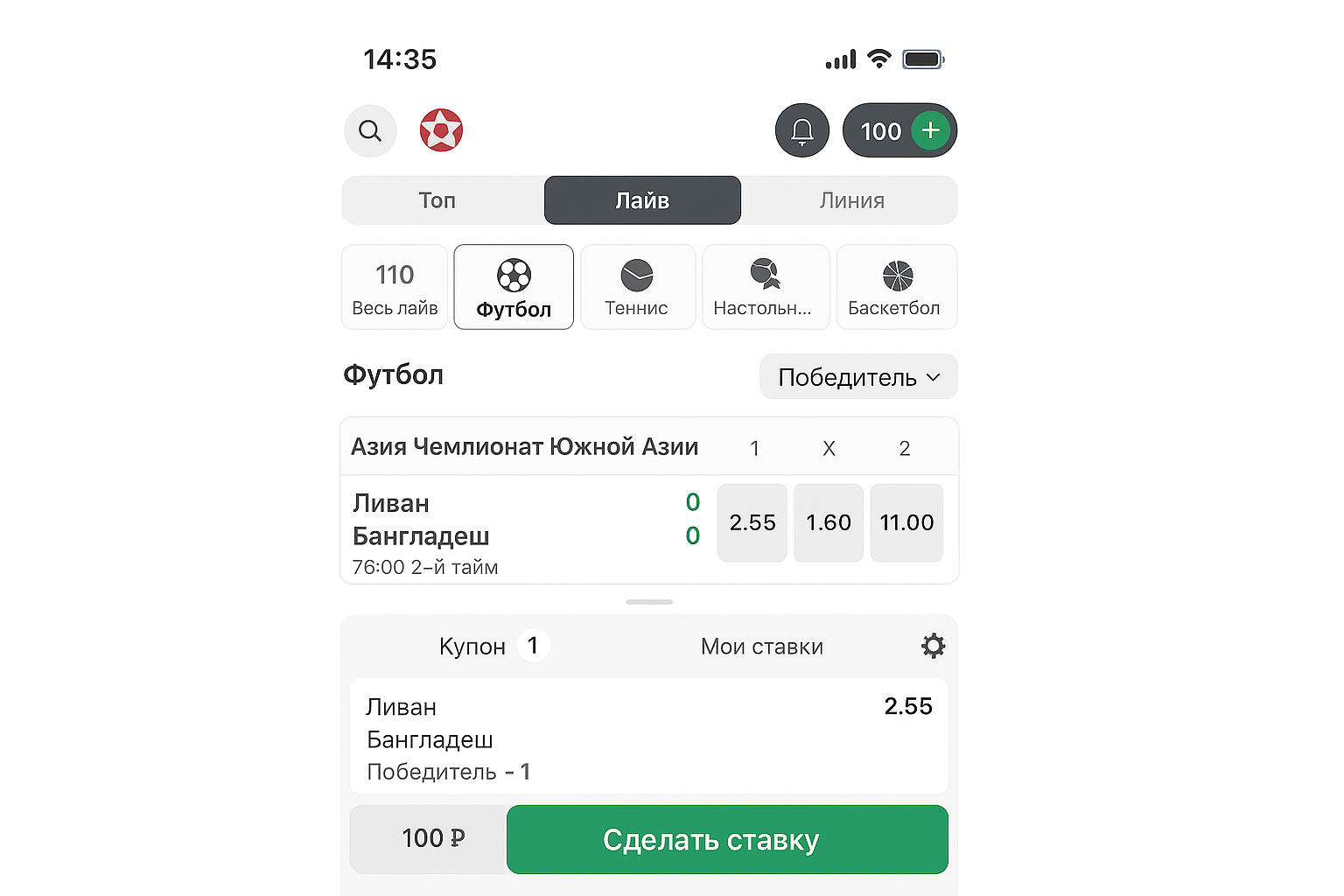• Финальный шаг: укажите сумму в купоне и подтвердите пари кнопкой.