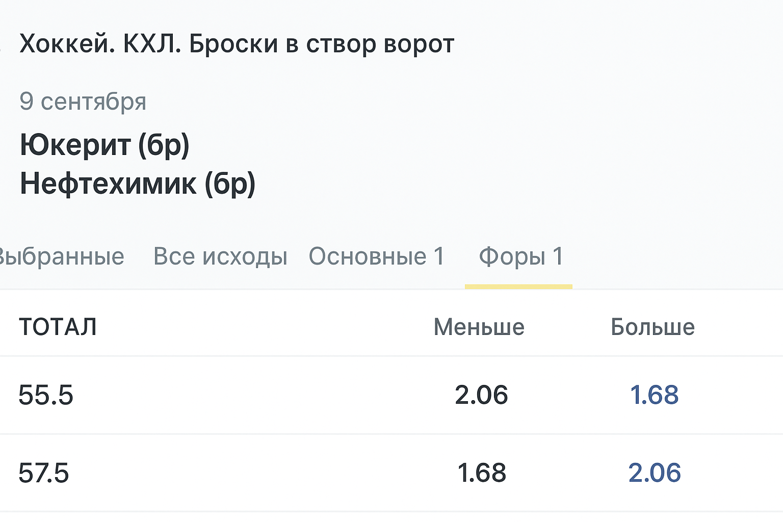 Хоккей. В хоккейной росписи добавляются иные метрики: бросок в створ, штрафные минуты и силовые приемы, а также выигранные вбрасывания. Для таких рынков букмекерская логика аналогична — нужно сравнить факт и порог.