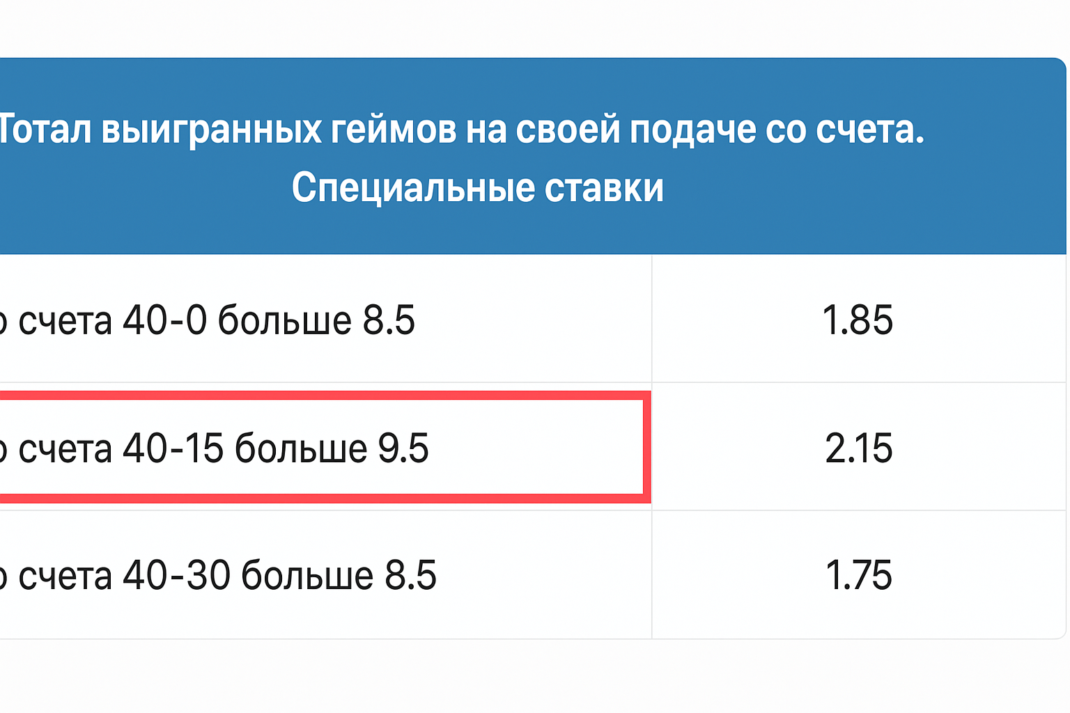 Представим пари на «больше 8.5 выигранных геймов на своей подаче со счета 40-0» с суммой 500 рублей. Для положительного расчета участники должны девять раз и более брать гейм на подаче всухую; в таком случае чистый выигрыш составит 425 рублей. Проверяйте коэффициенты и выбирайте момент — иногда выгоднее дождаться коридор в лайв.