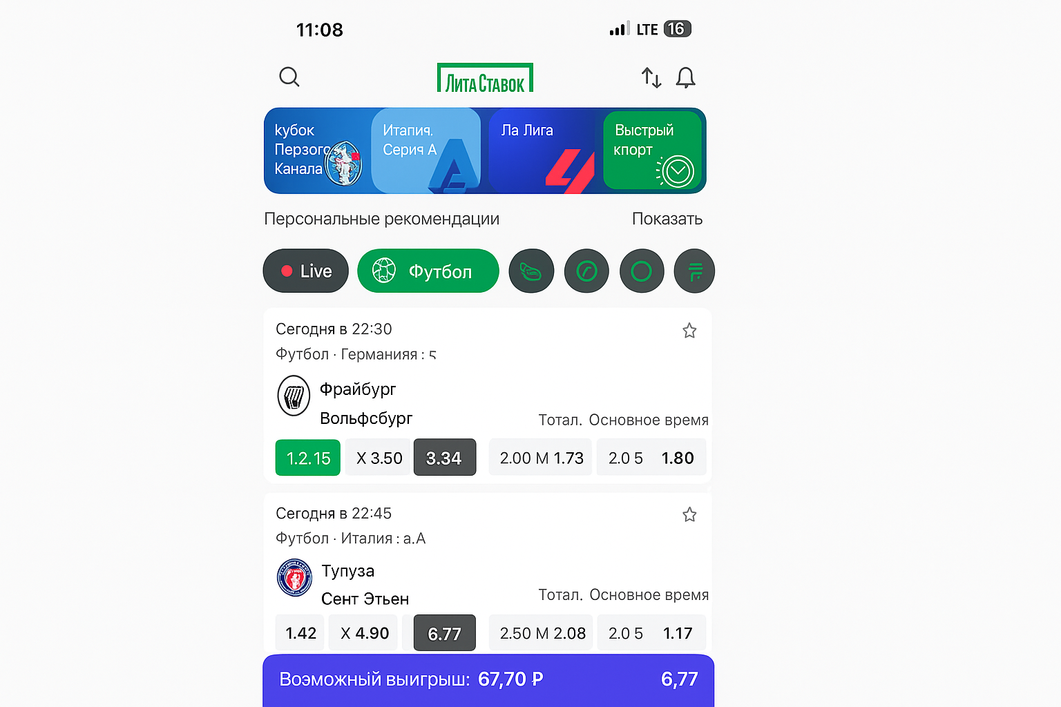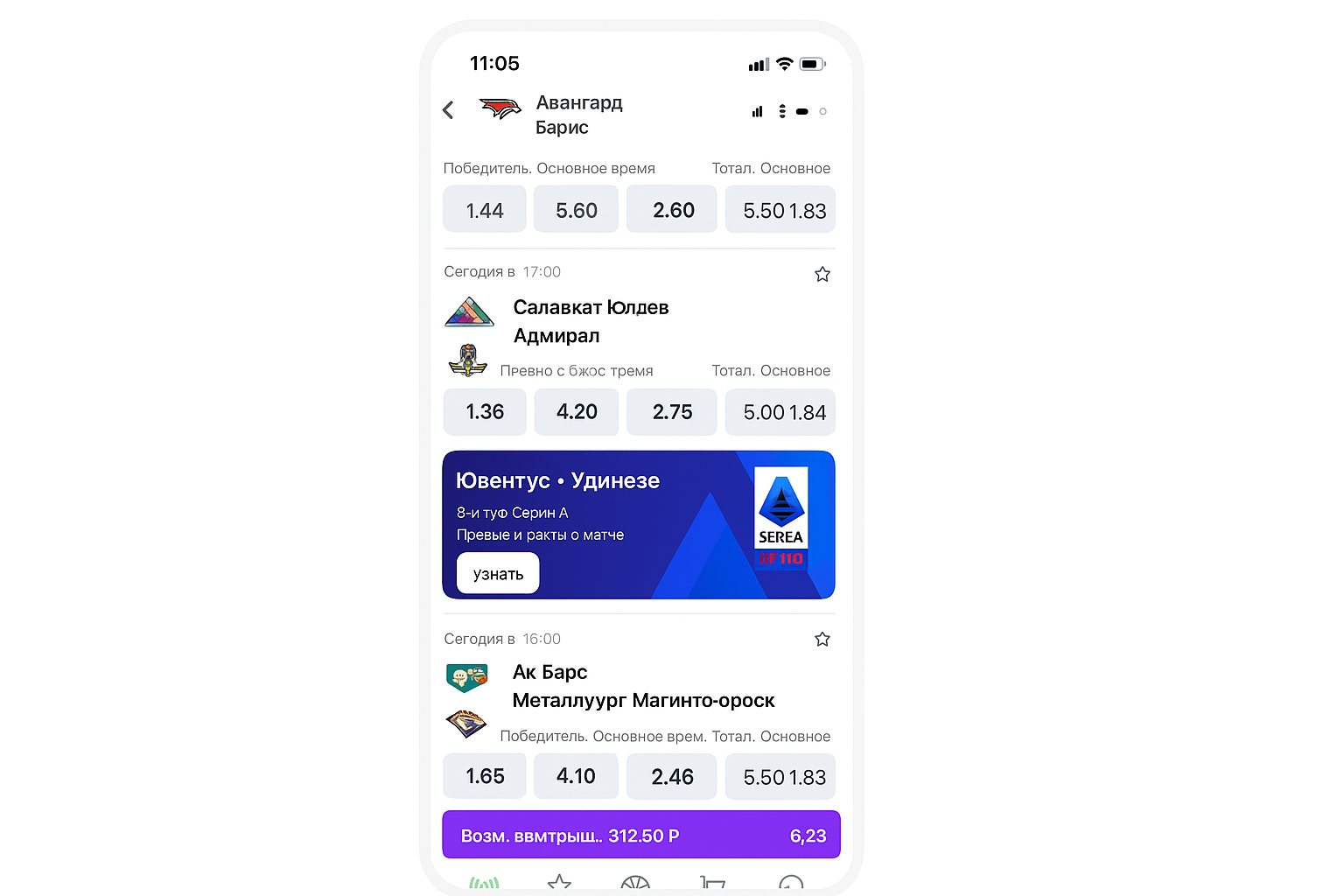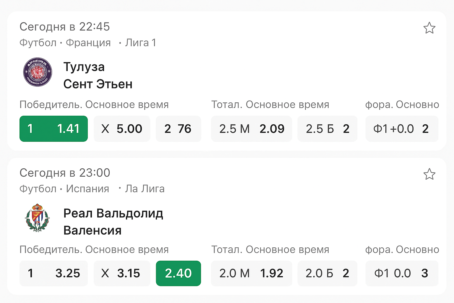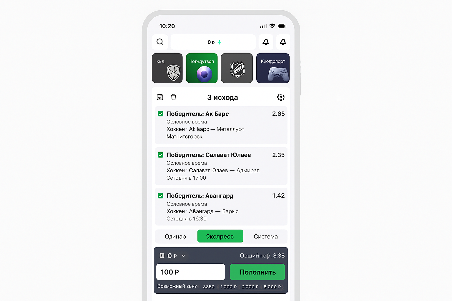 - Тап по выбранному коэффициенту мгновенно отправляет исход в купон (иконка вверху справа).