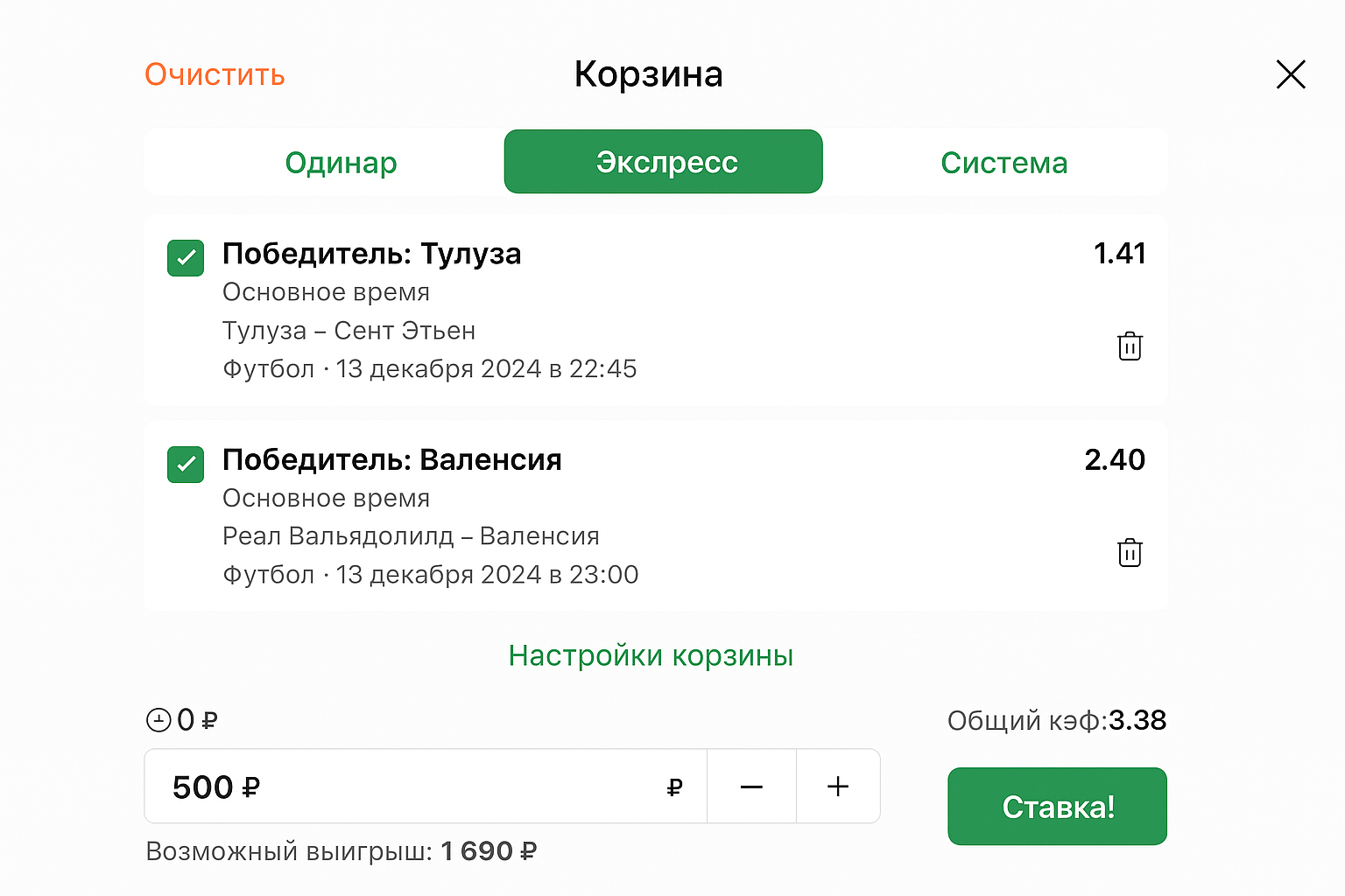 - Впишите сумму и подтвердите пари — экспресс будет принят системой букмекера.