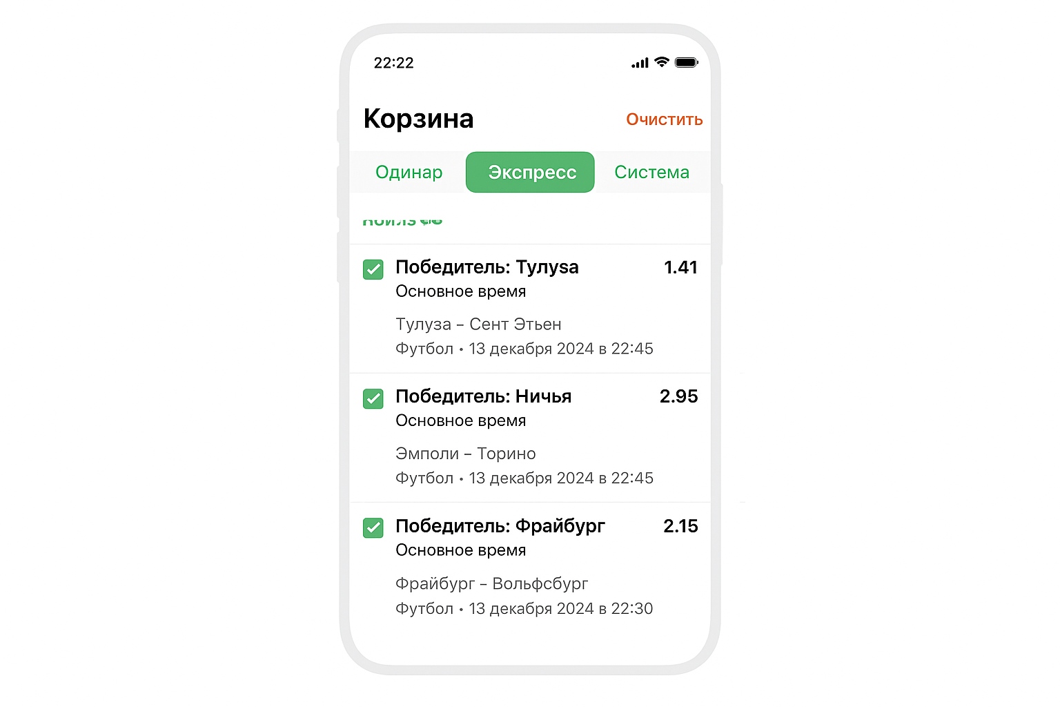 Сбор экспресса на телефоне повторяет логику мобильной версии сайта: различаются только внешний вид экранов и финальный шаг подтверждения ставки в приложении.