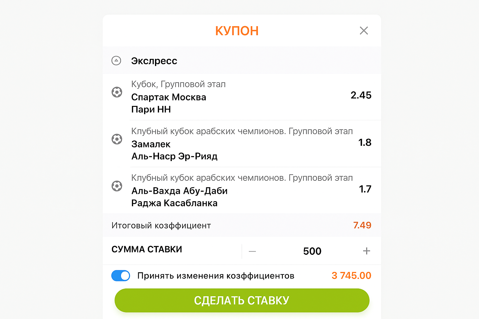 Если произойдёт возврат или отмена, итог изменится: такой исход учитывается как коэффициент 1.00. Например, при тотале ровно 2 мяча в игре «Аль-Вахда Абу-Даби» — «Раджа Касабланка» значение 1.70 заменяется на 1.00, а общий кэф станет 4.41 (2.45×1.8×1.00).