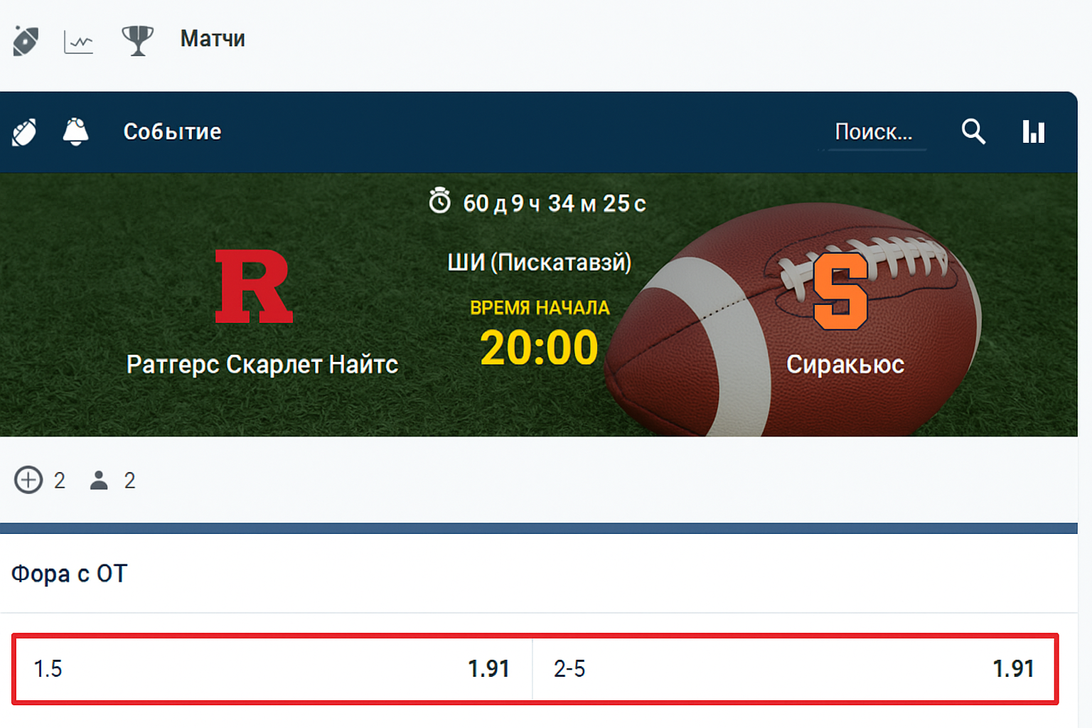 Для иллюстрации возьмём встречу NCAA по американскому футболу: «Ратгерс Скарлет Найтс» против «Сиракьюс», где сильнее по котировкам вторые, а потому на Rutgers предложен большой плюс пять.