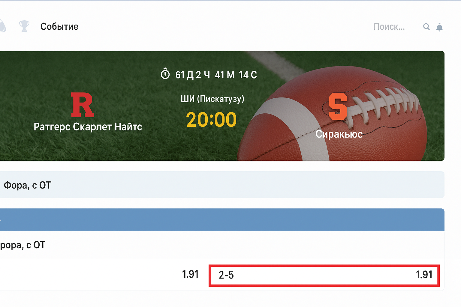 Для наглядности рассмотрим игру NCAA по американскому футболу: «Ратгерс Скарлет Найтс» против «Сиракьюс». Поскольку «Сиракьюс» очевидный фаворит, букмекер предлагает сделать ставку Ф2(-5) на гостей.