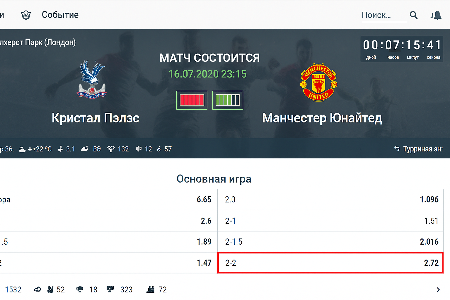 Для иллюстрации возьмём матч АПЛ «Кристал Пэлэс» — «Манчестер Юнайтед». У гостей статус фаворита, и контора предлагает сделать ставку Ф2(-2) с коэффициентом 2.76. При сумме купона 100 рублей чистая выплата составит 176 рублей, если исход сыграет.