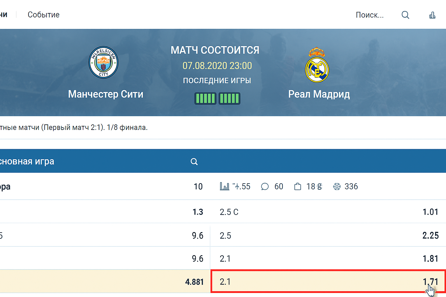 Для наглядности возьмем встречу Лиги чемпионов «Манчестер Сити» — «Реал Мадрид». Небольшим фаворитом считают хозяев поля, поэтому на гостей логично сделать ставку Ф2(+1). При вкладе 100 рублей пари на П2 дало бы 348 руб. чистыми, тогда как вариант Ф2(+1) принес бы около 71 рубля из-за более скромного коэффициента.