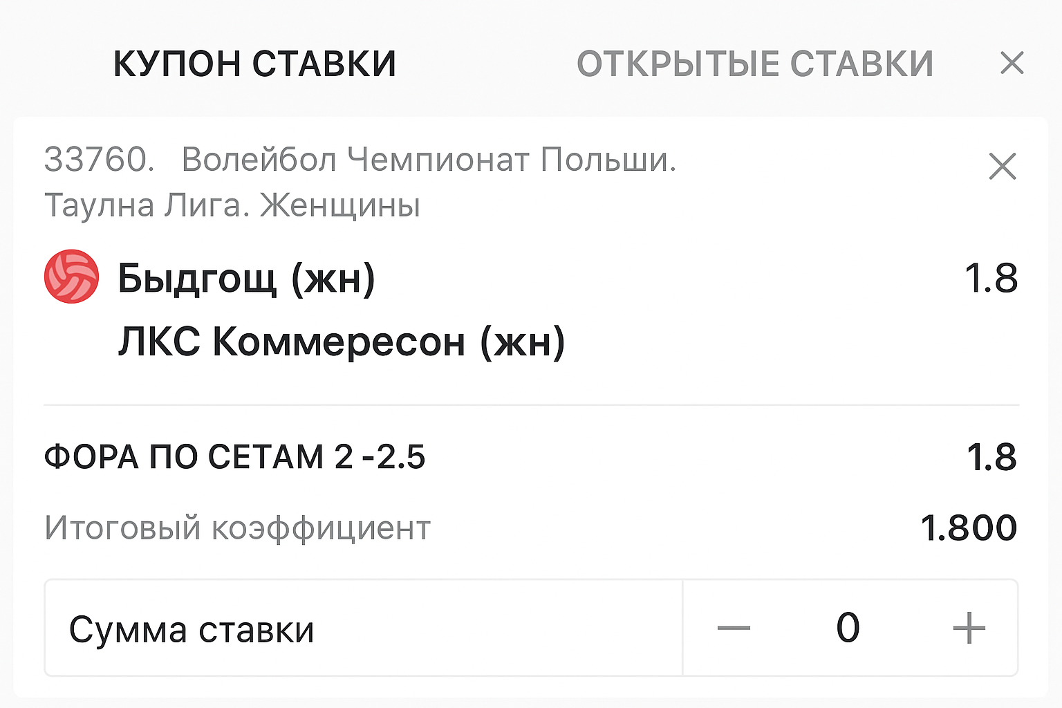 Для иллюстрации возьмем встречу женского первенства Польши: «Быдгощ» — «ЛКС Коммерсесон». На чистую победу гостей контора выставила символический коэффициент 1.05, зато минусовые форы предлагают более интересные кэфы и позволяют варьировать спред.