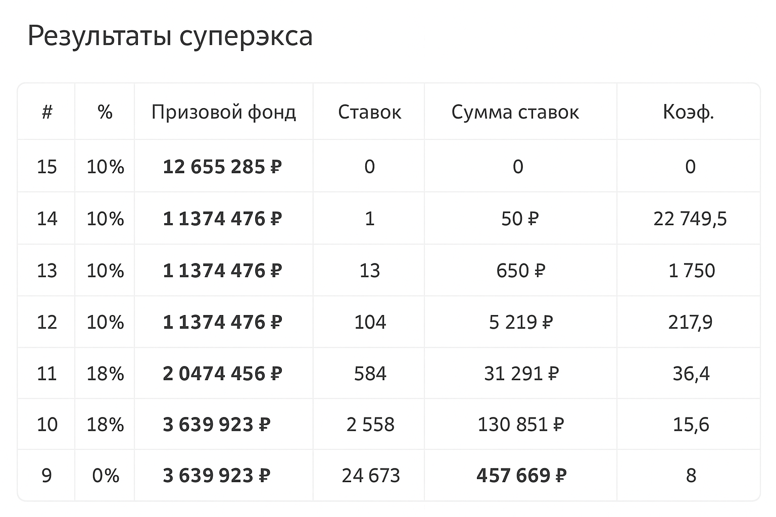 Слева в таблице — количество точных попаданий; затем отображается доля общего пула для соответствующих групп (15, 14, 13, 12, 11, 10, 9); наиболее значимый столбец — коэффициент, которым множится ваш вклад.