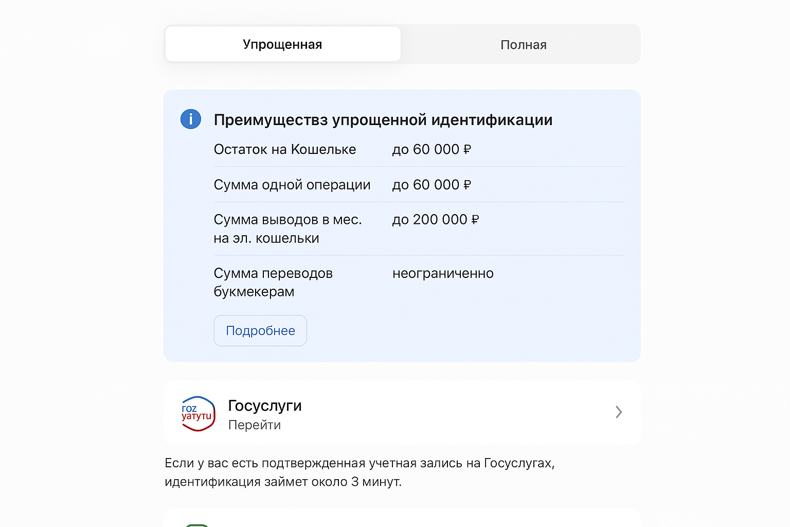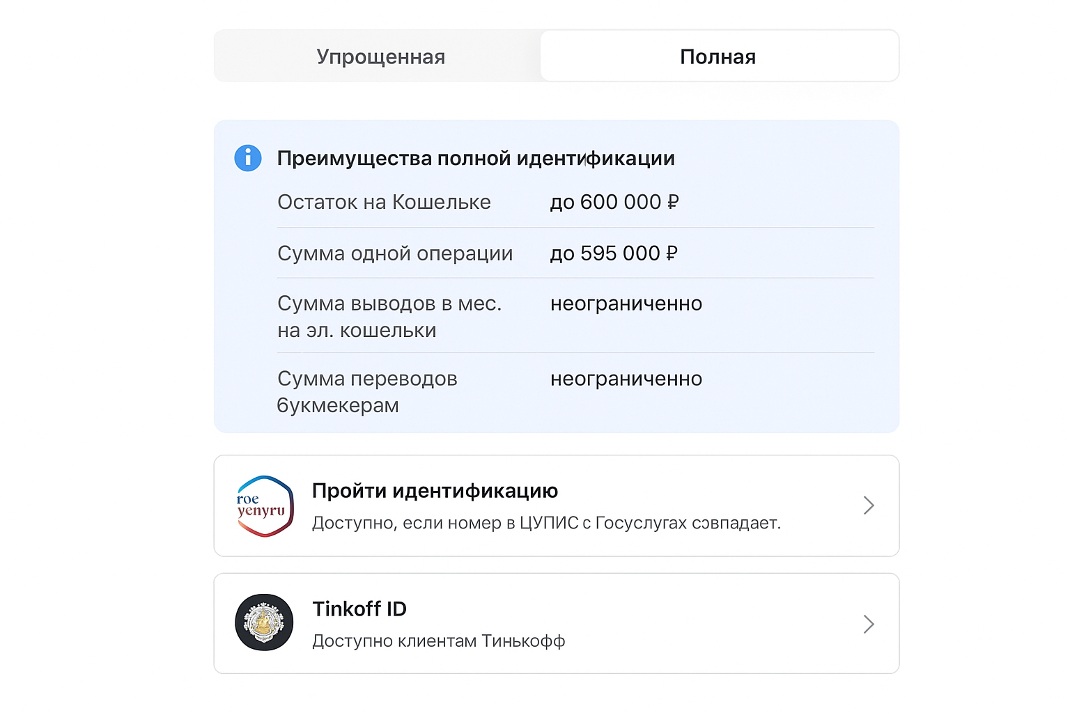Вариант 3 — полная идентификация (Contact, Т‑Банк ID, Госуслуги). Полный уровень можно пройти удаленно и бесплатно: подойдет Т‑Банк ID для клиентов банка и сервис Госуслуги. Важно: телефон, указанный в аккаунте услуг, должен совпадать с номером, на который оформлен кошелек ЕЦУПИС; это требование для корректной KYC‑проверки.
