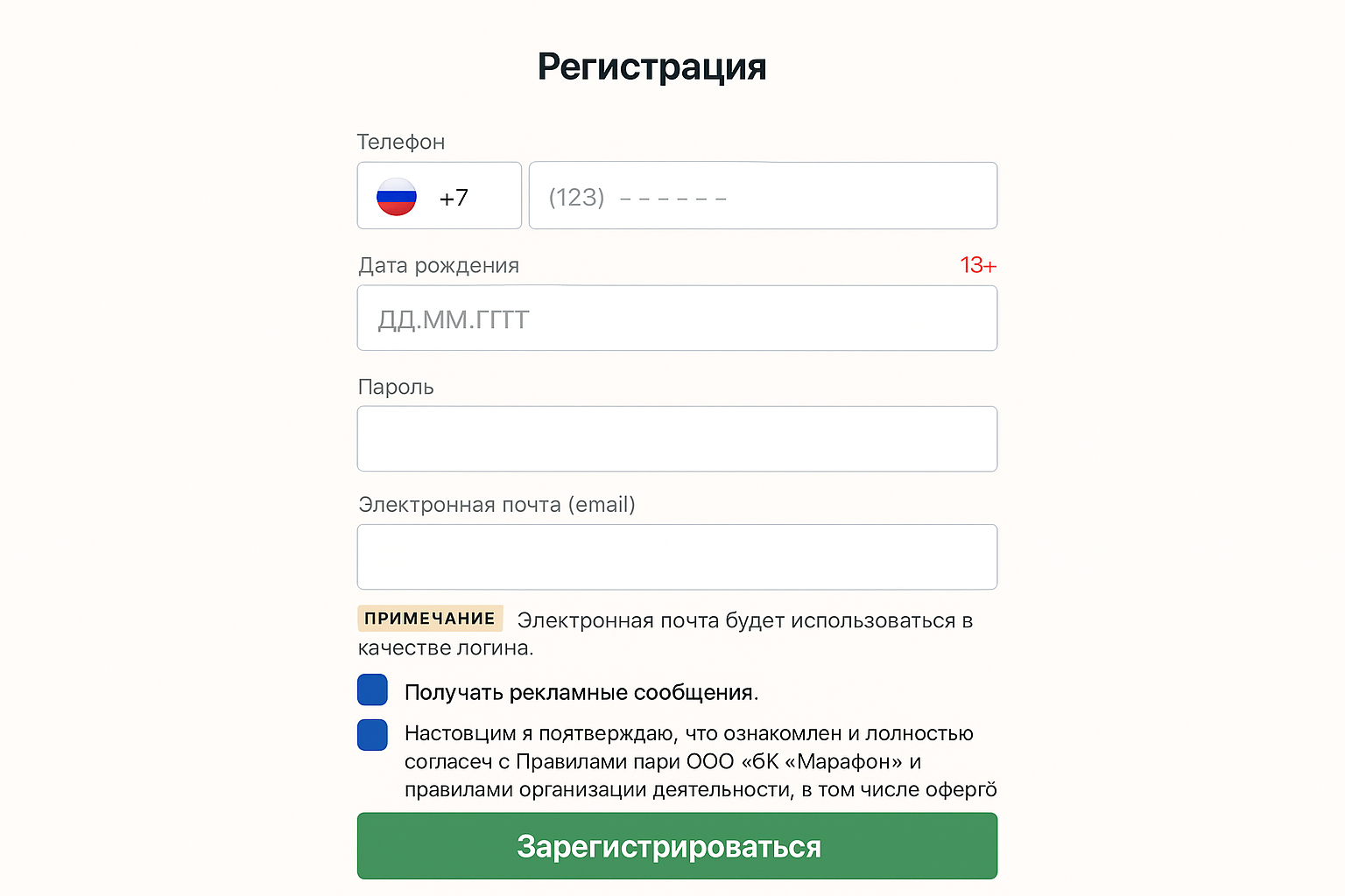 Поставьте отметку о согласии с правилами букмекерской компании и политикой обработки данных, затем нажмите «Зарегистрироваться». Это создаст аккаунт в БК и начнет процедуру подтверждения личности.