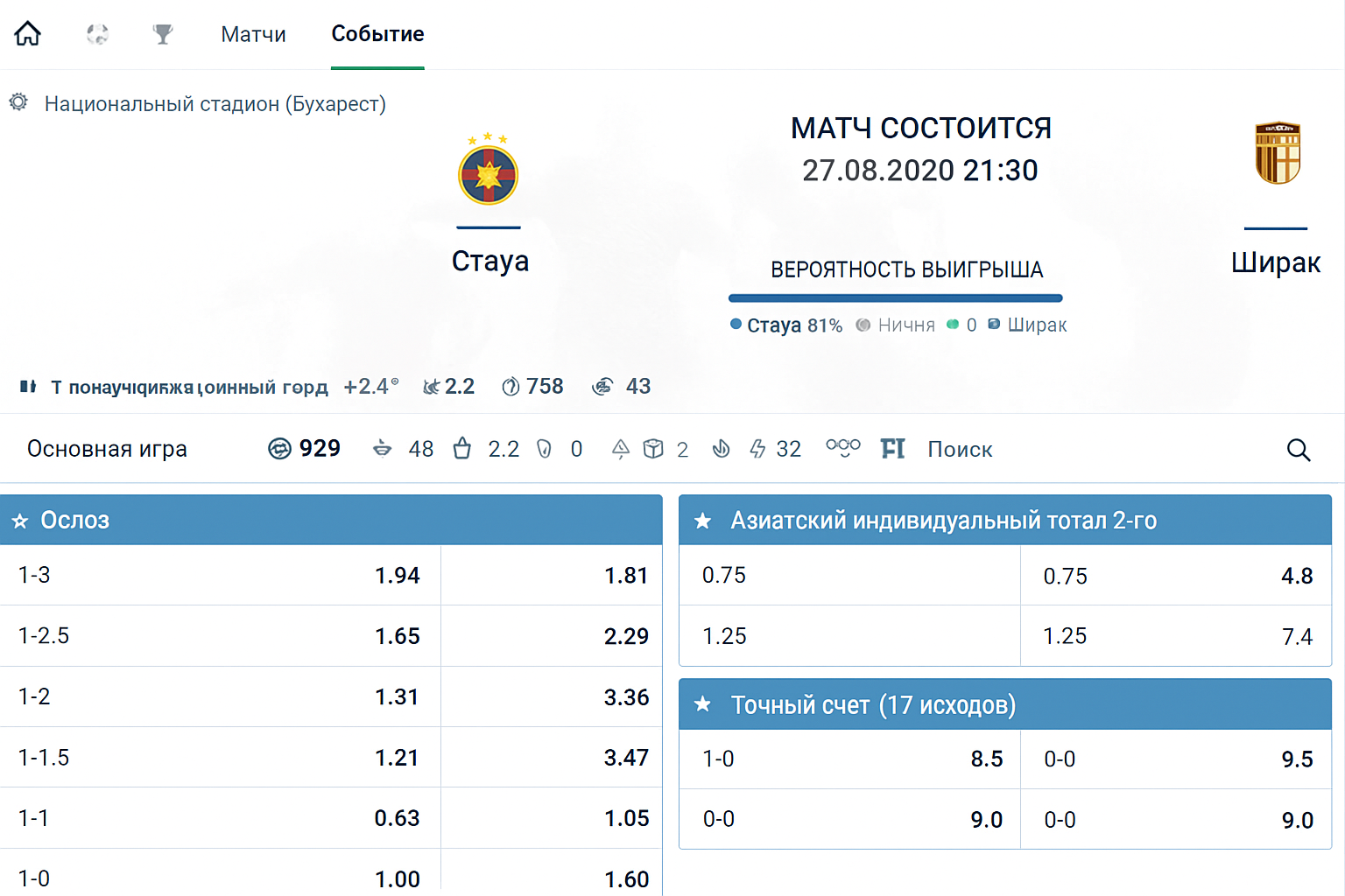 В футбольной росписи этот маркет применяют к голам, предупреждениям, офсайдам и прочим статам. В пример возьмем игру «Стяуа» — «Ширак», где выбран исход «ИТ 1-го — меньше 2.5» на основное время.