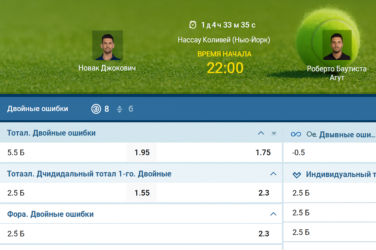Купон зайдет при 0–2 двойных ошибках у первой ракетки пары; начиная с трех — поражение по данному исходу. Для прогноза важно свериться с формой спортсмена и особенностями покрытия.