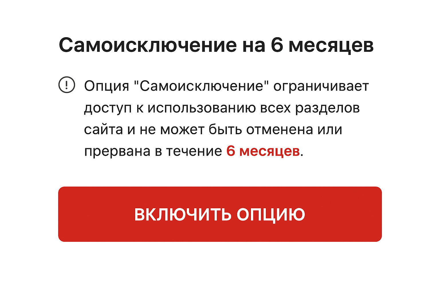Без ожидания расчёта пари и без предварительного вывода средств со счёта для ставок допускается включить полугодовую блокировку. Одного подтверждения достаточно — после чего любые действия по аккаунту и доступ к разделам личного кабинета будут недоступны на шесть месяцев.