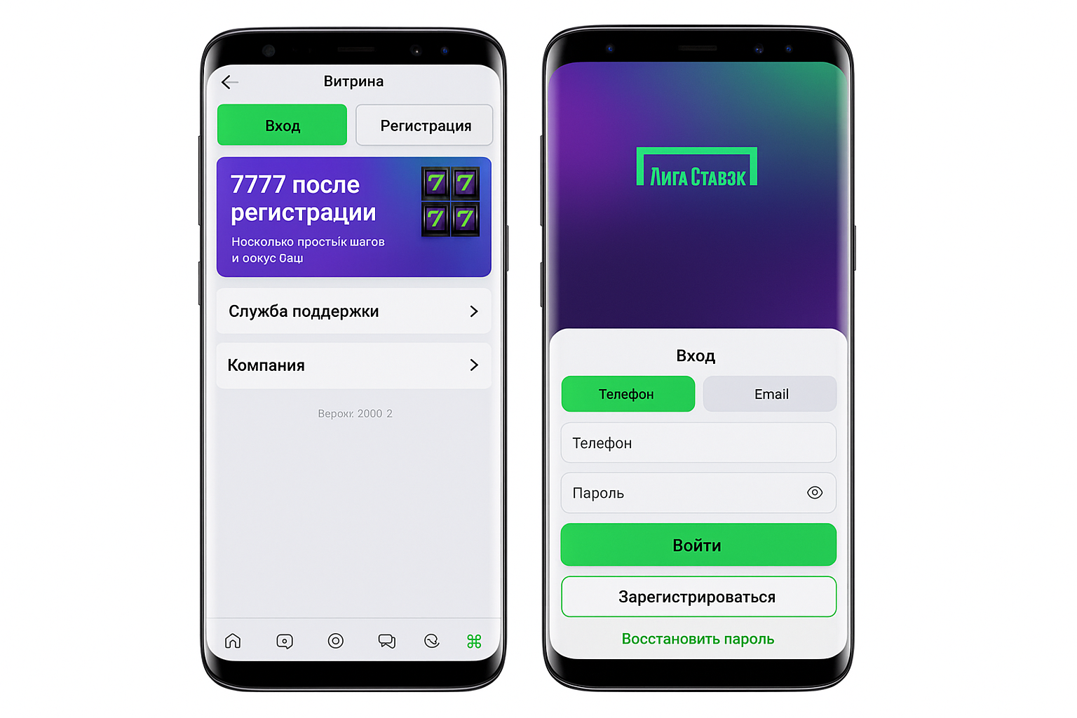 Для входа используются контактный телефон или e-mail, указанные при регистрации, и установленный пароль.