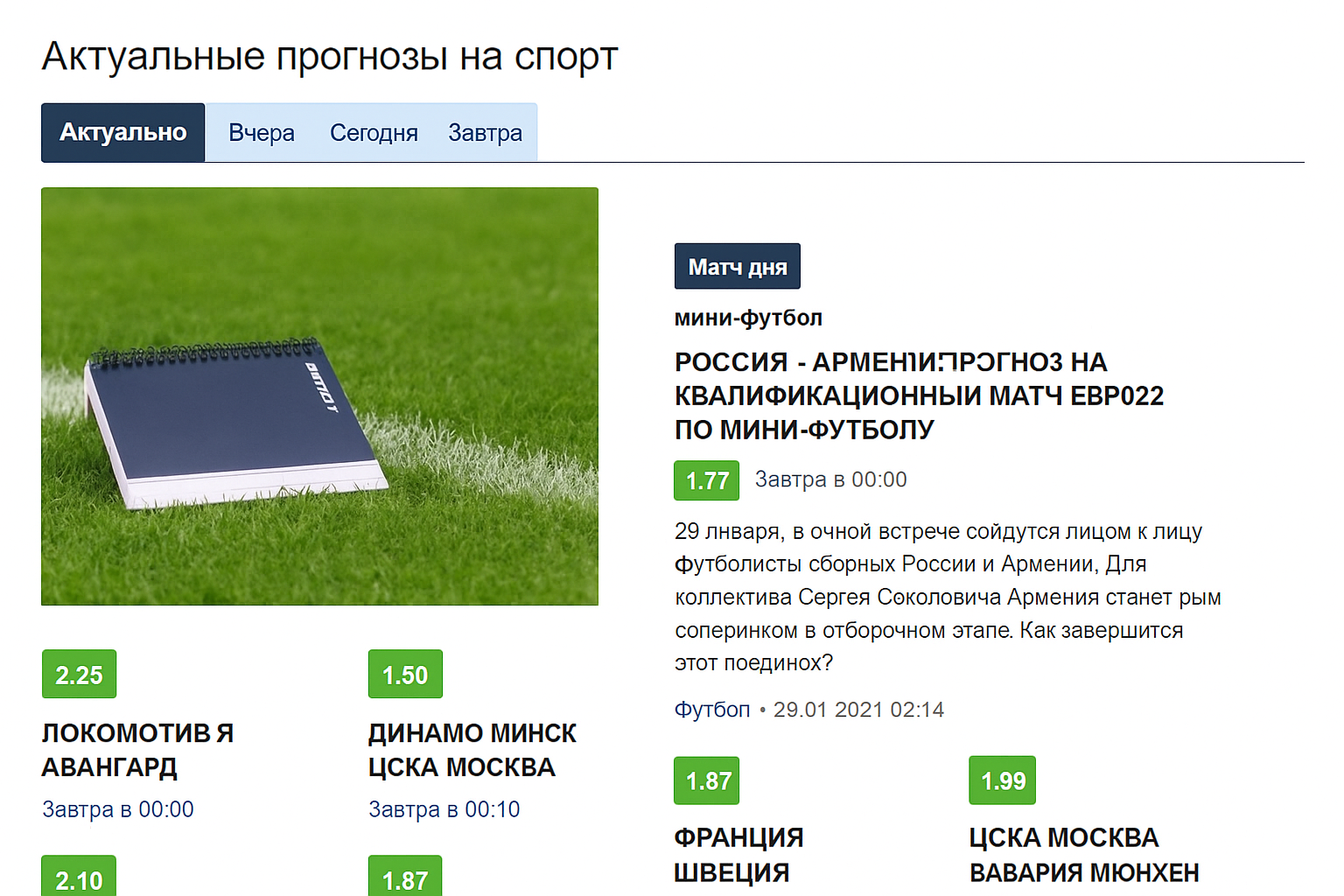Прогнозы. Редакция регулярно публикует подборку вариантов на спорт: какие исходы рассматриваются сегодня, на завтра и что уже выходило вчера. Сортировать по конкретному виду спорта нельзя.