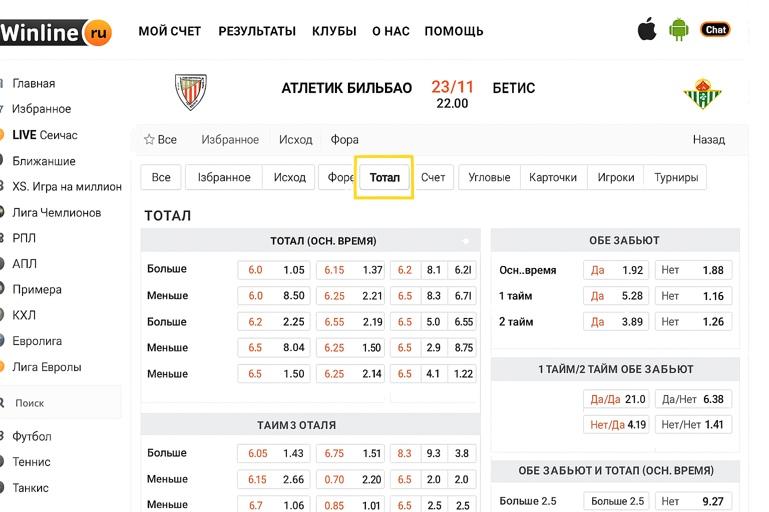- Обширная сетка тоталов, приемлемые прематчевые цены и строгая работа замков; подловить арбитраж сложновато, зато линия стабильна — Winline. Приложения iOS и Android.