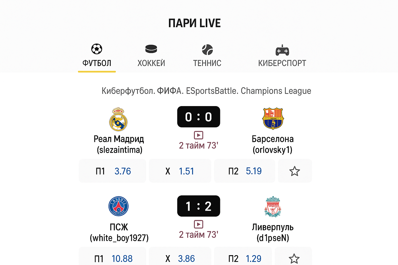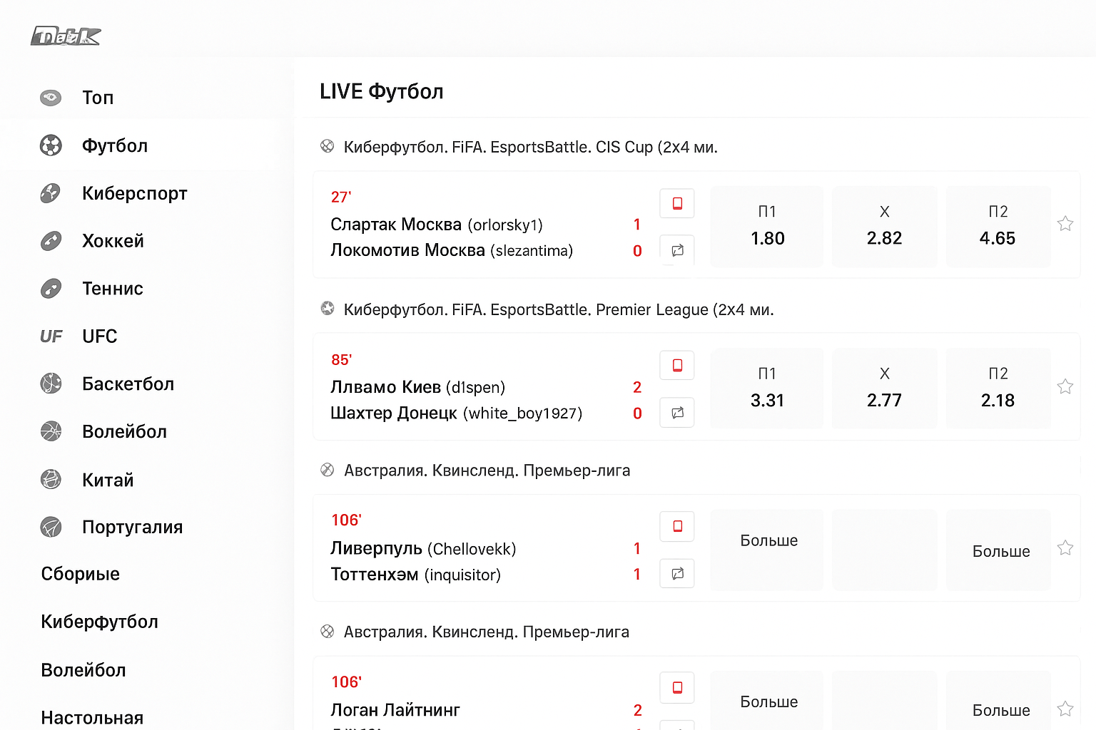 В эфире доступны состязания более чем по десятку дисциплин — букмекерская платформа показывает разные турниры в режиме live. Для каждого вида спорт формирует отдельную ленту событий, где легко ориентироваться по лигам.