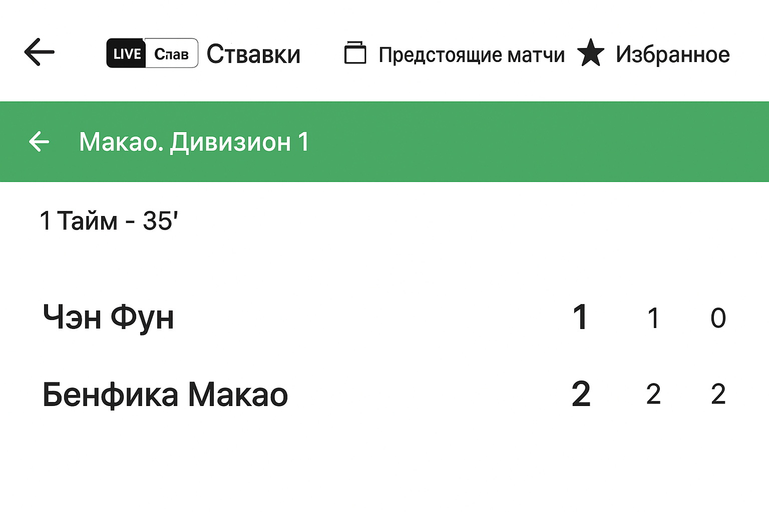 Если видео недоступно, на странице встречи включается графический матч-центр: там отображаются счет, хронометраж, голы по таймам и иногда угловые или удаления. Подобная инфографика встречается почти во всех live-событиях, вплоть до редких турниров вроде чемпионата Макао, и помогает принимать решения по ставкам при ограниченном стриминге.