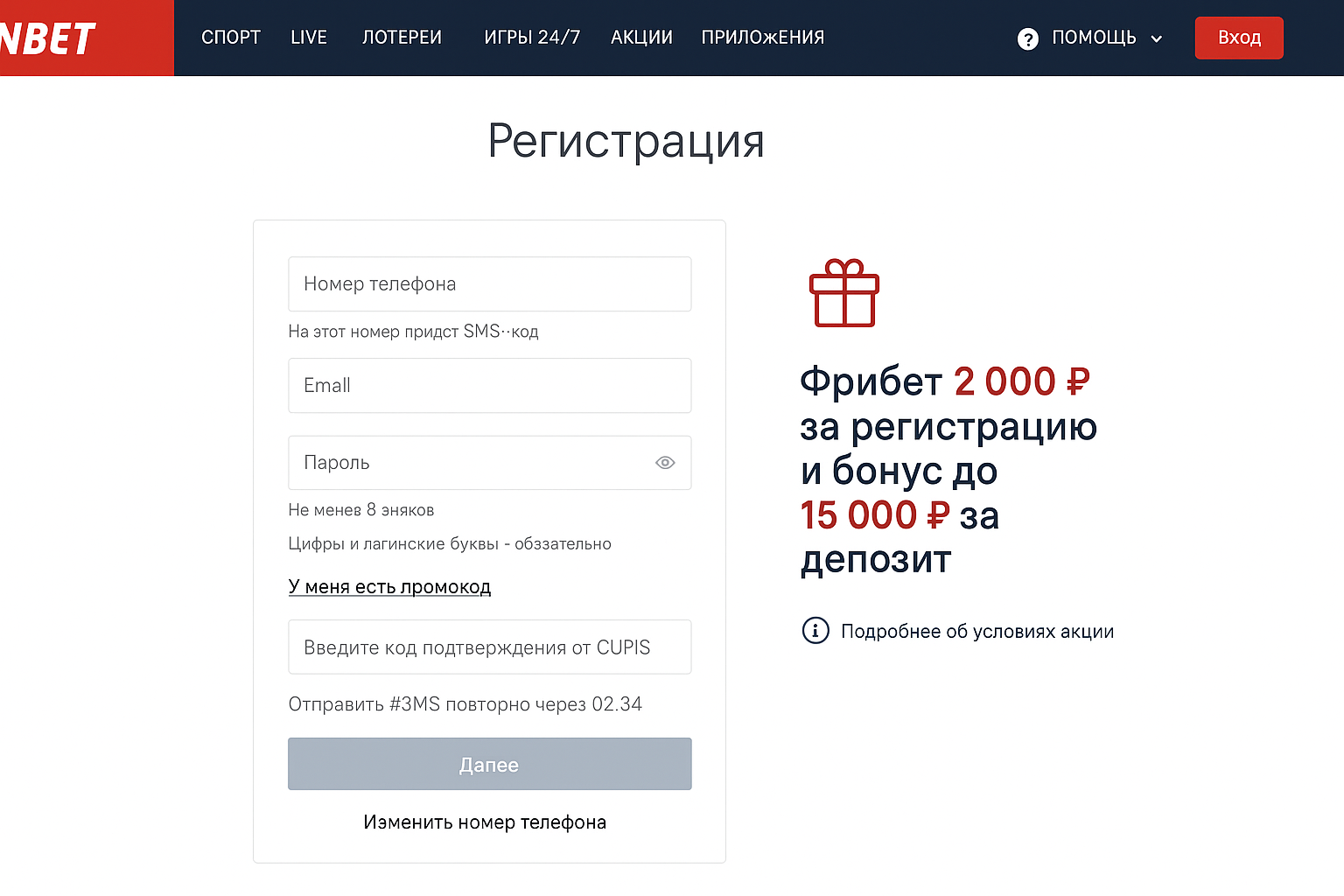 В специальное поле введите код из СМС — после подтверждения доступ к ставкам будет открыт.