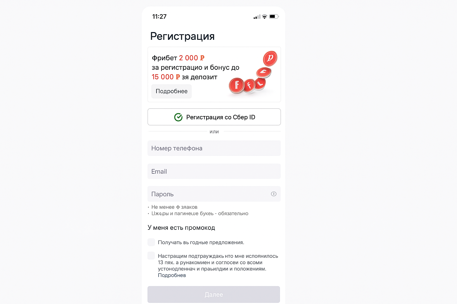 - Заполните анкету, при наличии укажите промокод, подтвердите совершеннолетие и согласие с правилами бк.