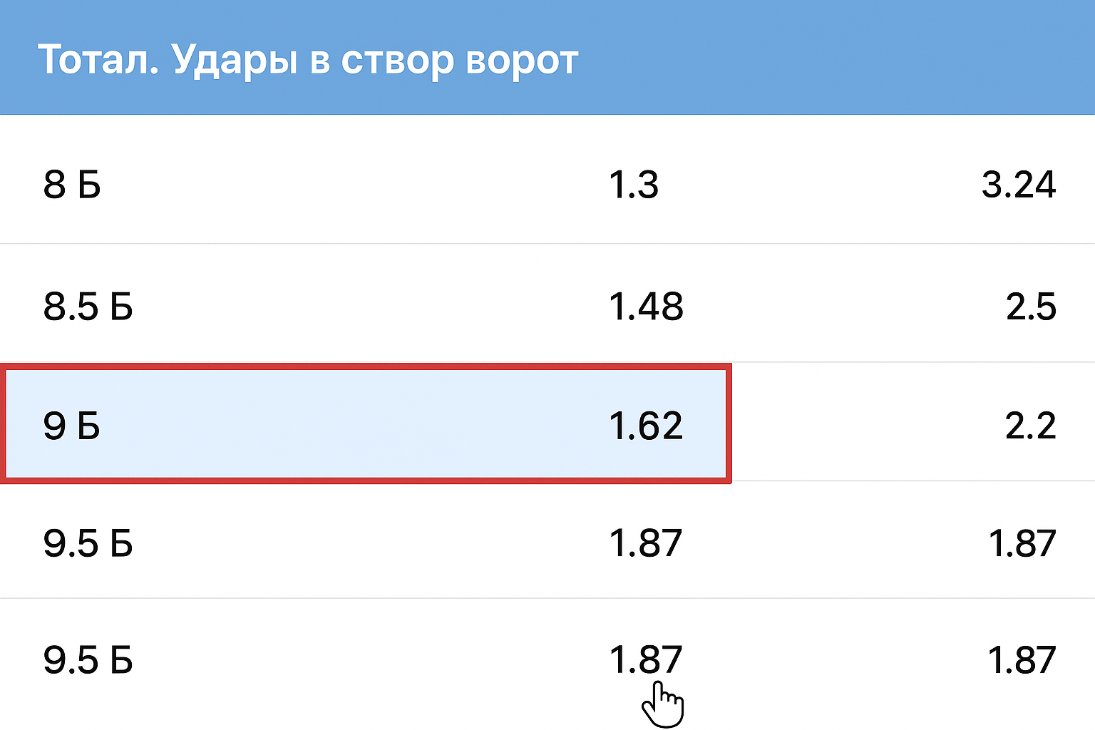 Представим ситуацию: букмекер предлагает ТБ(9.0) по ударам в створ на основное время. Как только обе команды суммарно насобирают десять или больше попыток, ставка сыграет. При котировке 1.62 и сумме пари 100 рублей чистый выигрыш составит 62 рубля; коэффициент отражает оценку результативность по версии БК.