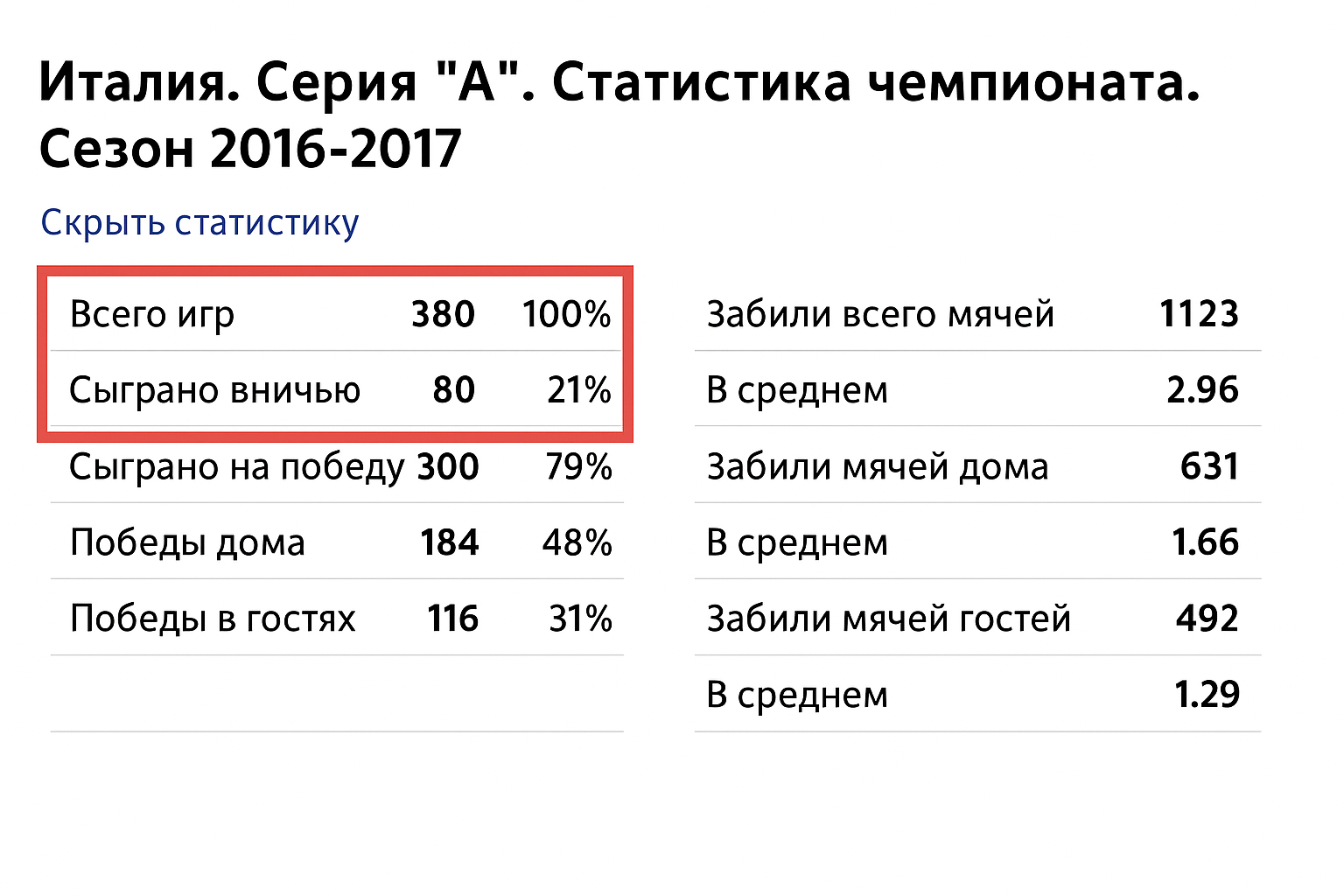 Статистика недавнего сезона: в Серии А за 380 матчей ничейный исход фиксировался 80 раз — примерно 21%. Для сравнения, в Английской Премьер‑лиге в те же 380 игр ничьи случались 84 раза (около 22%), то есть всего на четыре поединка больше.