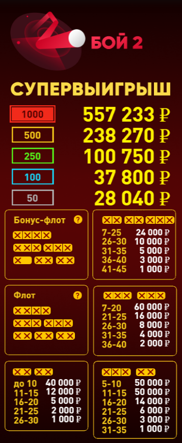 - Флот: Потоплены все корабли. Максимальный выигрыш, не считая джекпота. Как и в предыдущем случае, необходимо навести указатель на вопрос, чтобы ознакомиться с конкретными суммами.