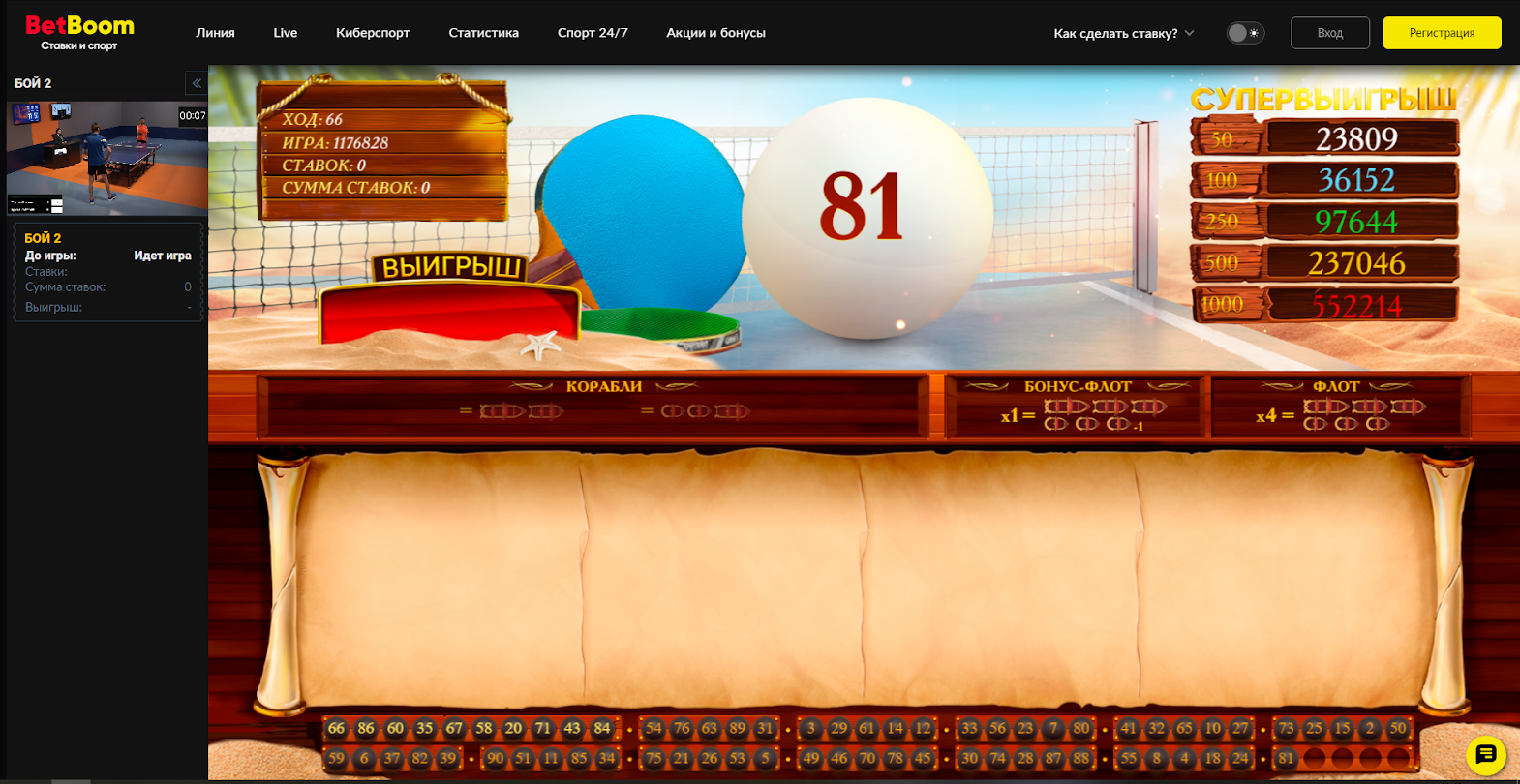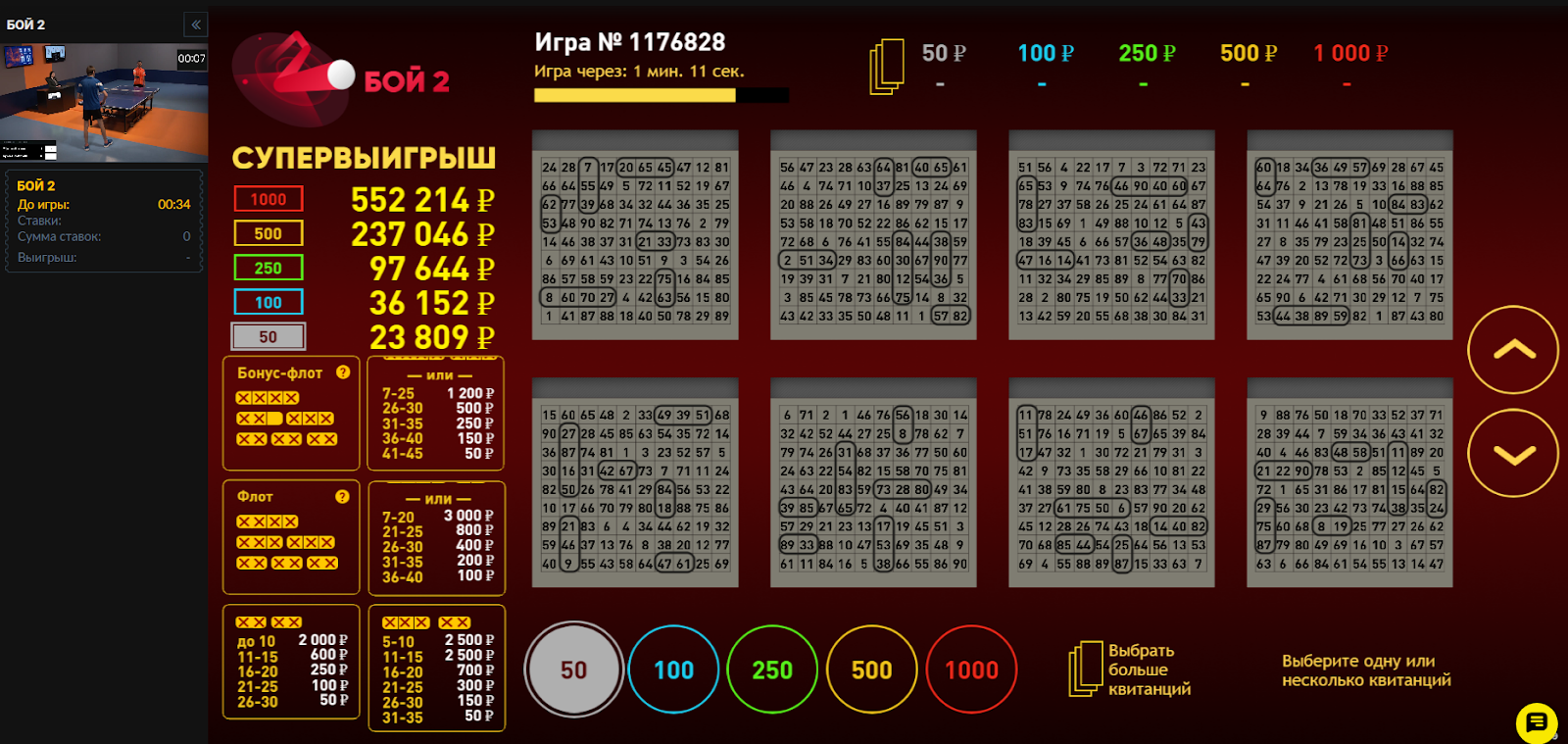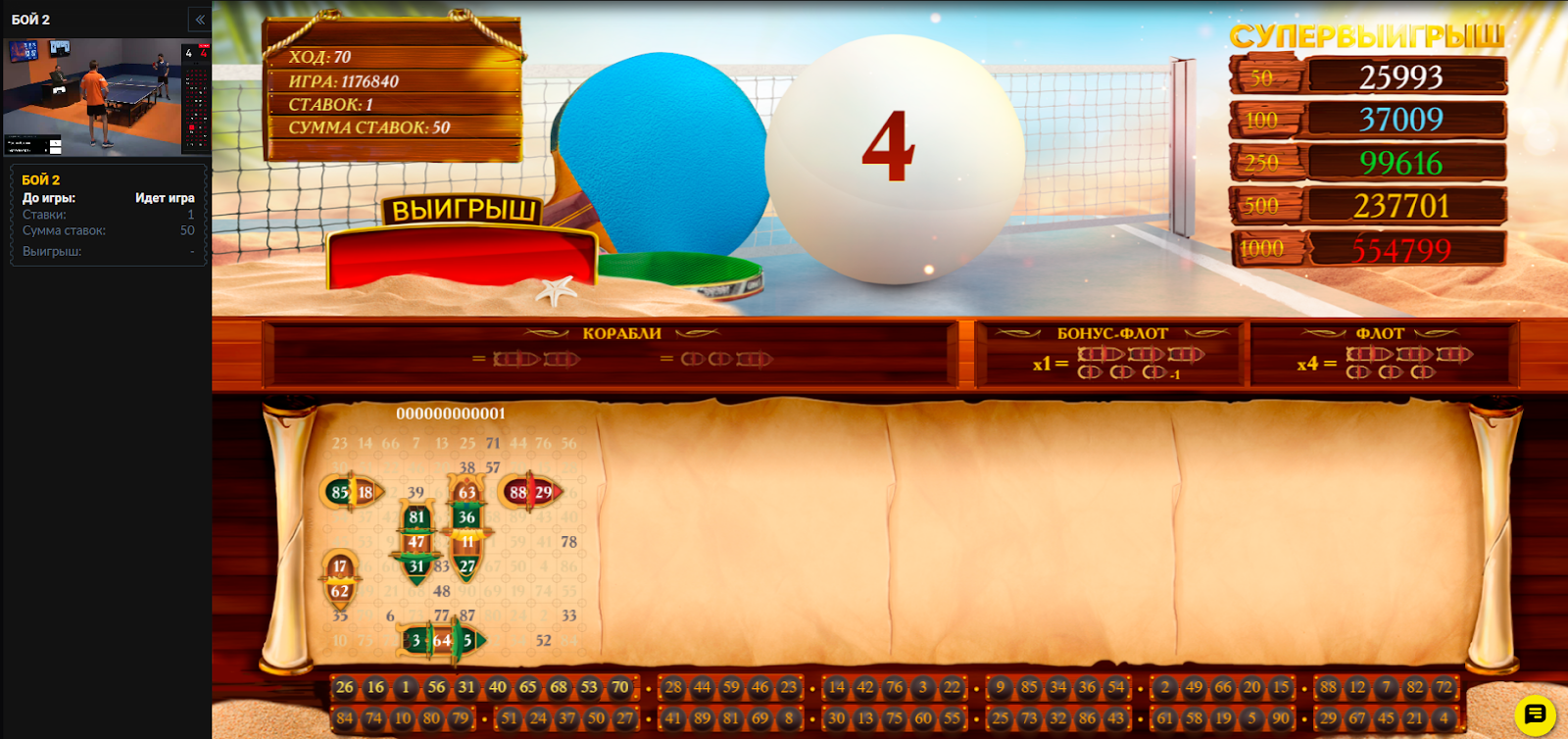 В нем игроки могут покупать виртуальные бланки с числовыми полями, где выделены некоторые соседние клетки, как в классической игре «Морской бой». А сколько кораблей будет сбито и, собственно, сам выигрыш зависит от событий в реальном профессиональном матче по настольному теннису. Он и транслируется на экране игры.