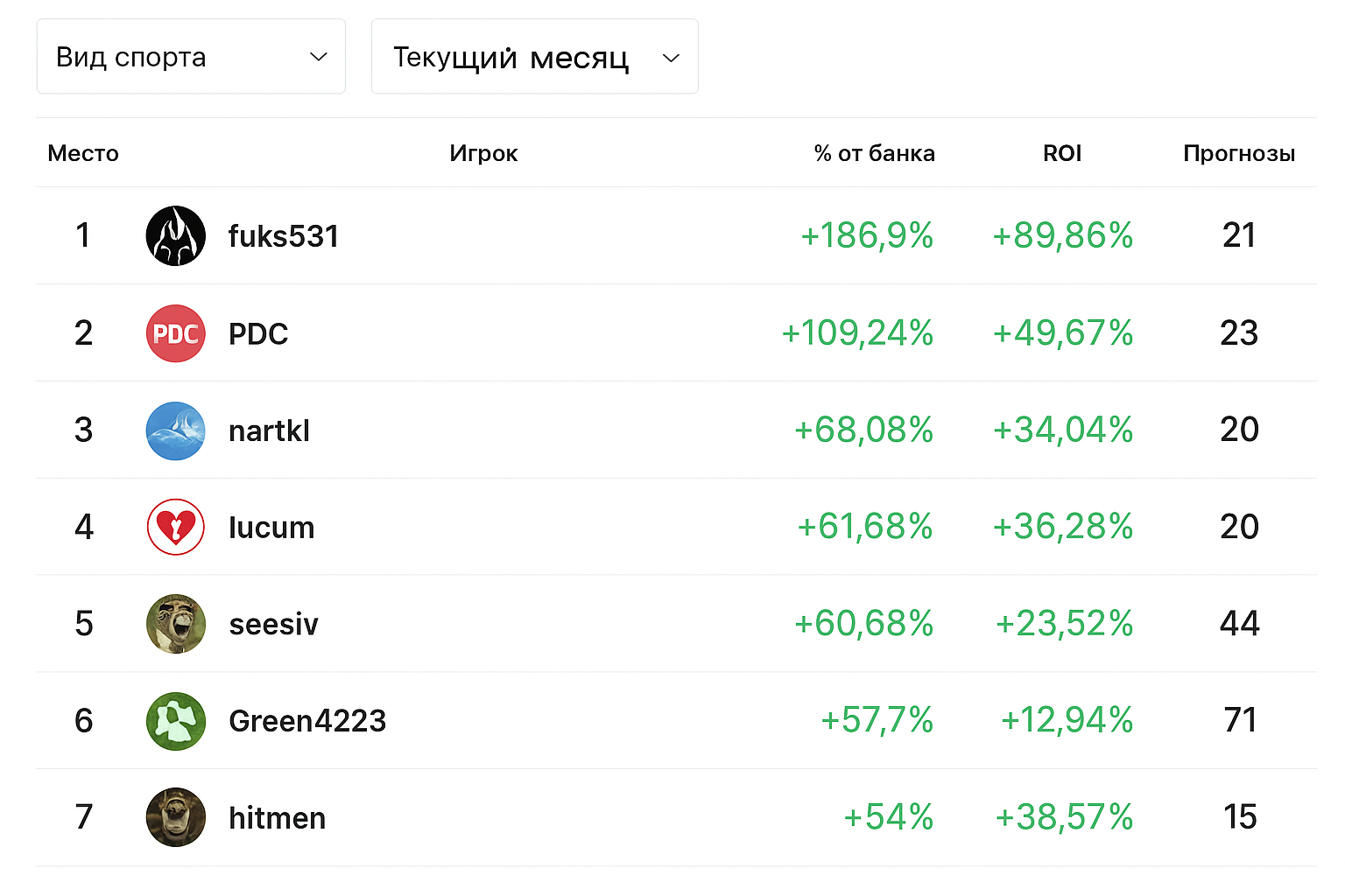 В Betonsuccess доступен персональный профиль, в котором фиксируется каждая ставка; динамические графики и обновляемые рейтинги позволяют выбирать сильных прогнозистов как в общем зачёте, так и в отдельных видах спорта. Это помогает быстро отсеять случайные всплески и найти стабильные аккаунты.