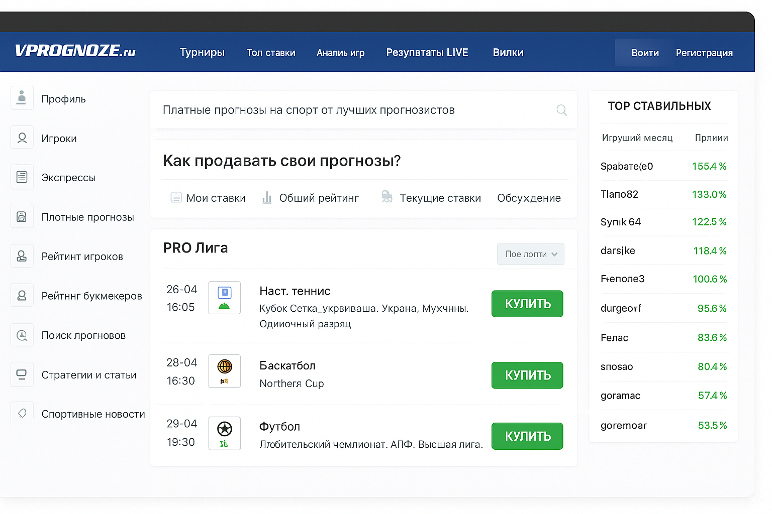 Vpluse. Этот ресурс больше ориентирован на новичков: у прогнозов указывают оценку вероятности в процентах, виден ROI автора и его история ставок. Многие публикации сопровождаются краткими обоснованиями — аргументы, статистика, ссылки на форму команд и малоизвестные факты о спортсменах, что помогает учиться аналитике.