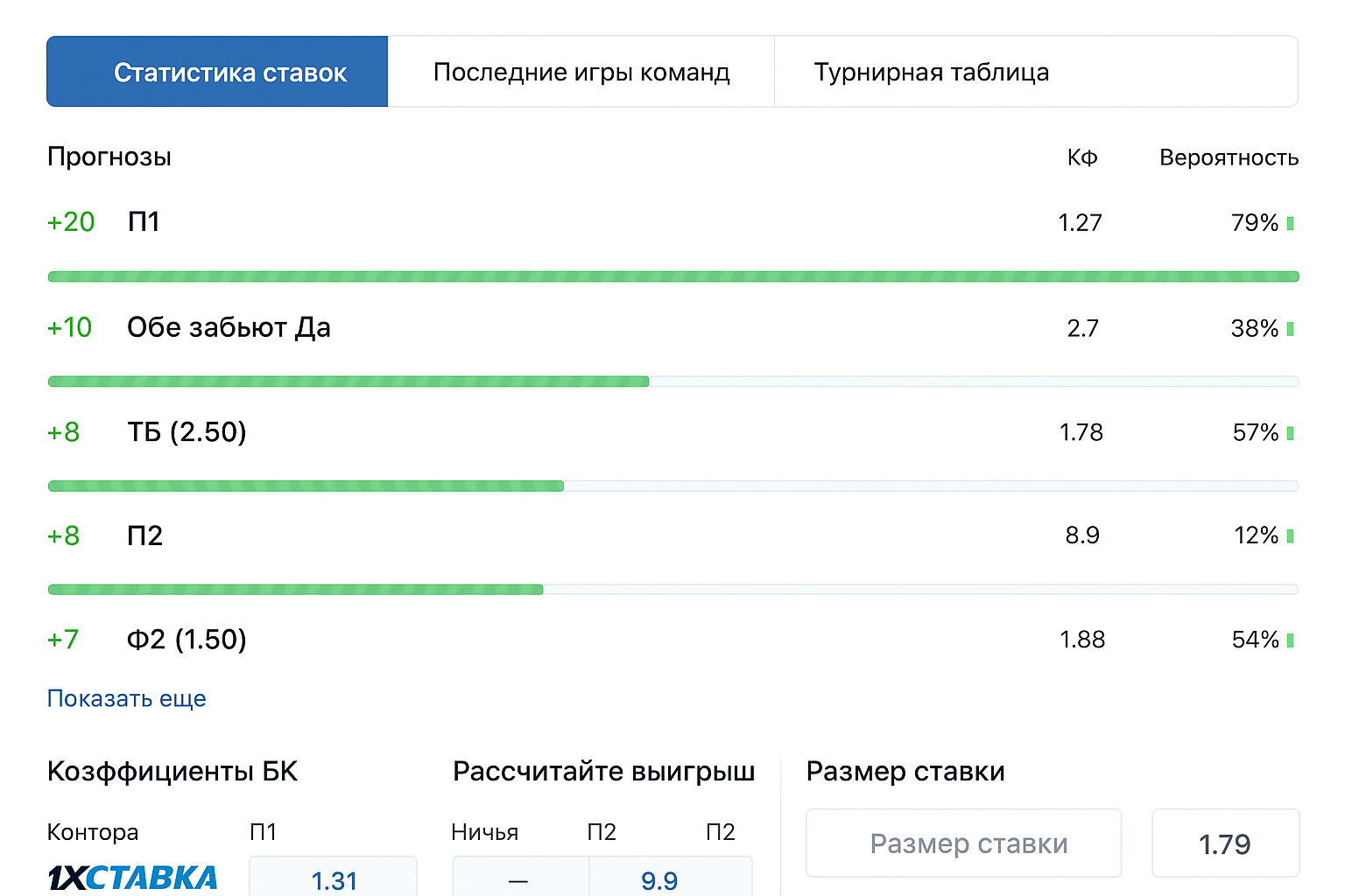 Дополнительно показываются котировки ведущих букмекеров по ключевым рынкам, поэтому легко сравнить линии и выбрать наиболее выгодное предложение под конкретную стратегию.