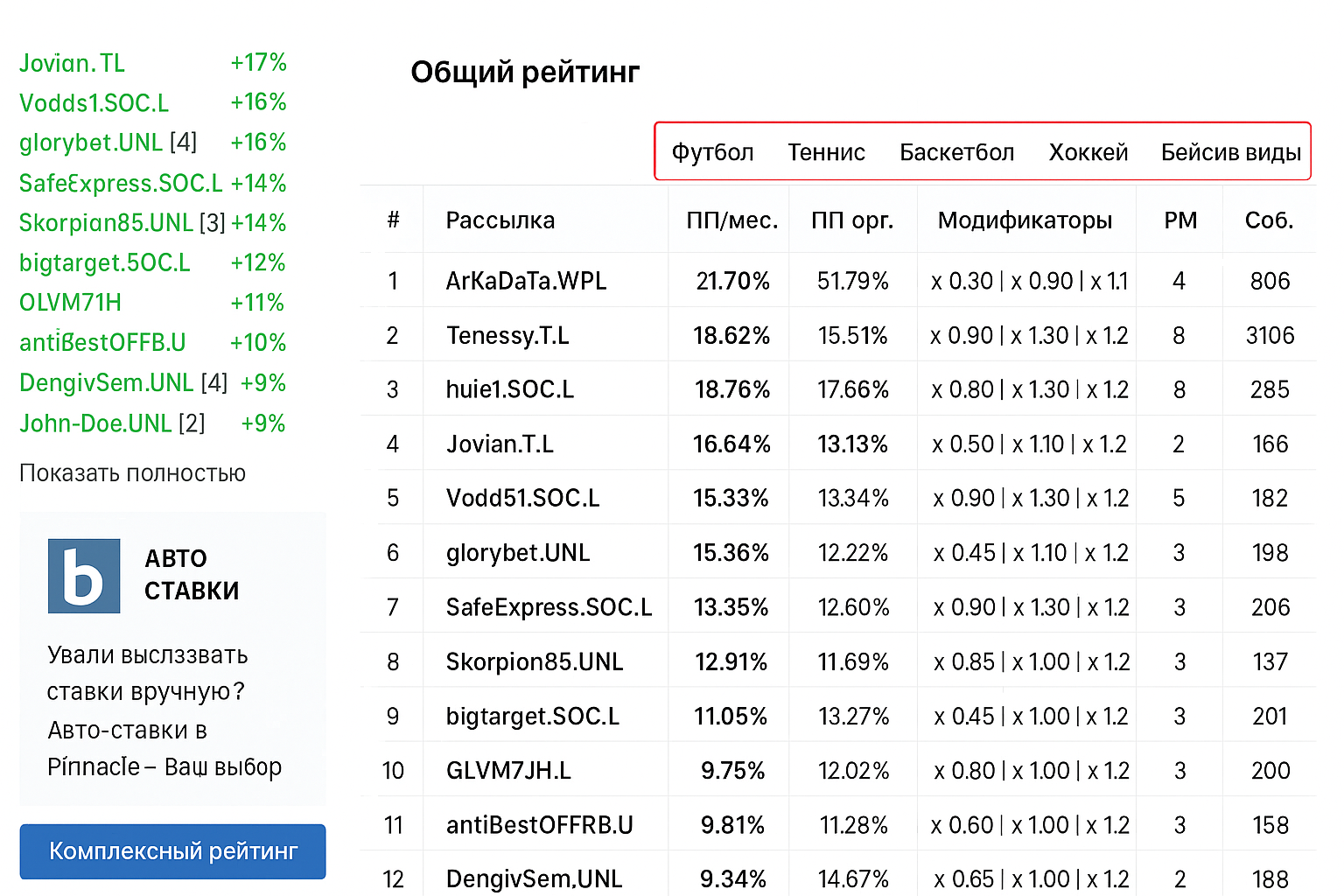 Betonsuccess. На площадке собраны рейтинги топовых капперов по видам спорта с удобной статистикой и графиками, показывающими динамику результатов по периодам. Это помогает быстро понять, где была серия апсетов, а где стабильный плюс.