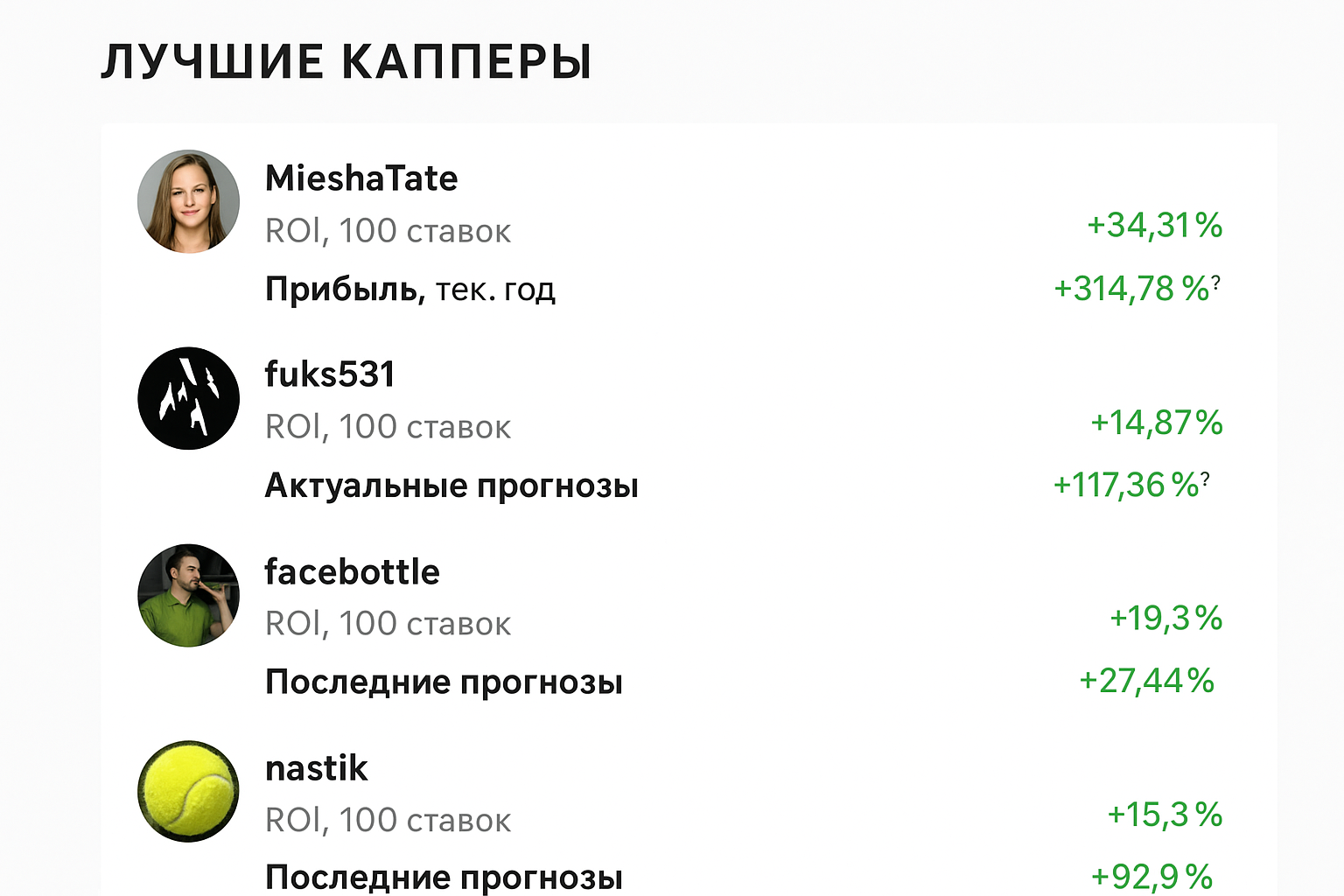 - Рейтинговый верификатор: независимая площадка, где размещаются только проверенные специалисты; у каждого — досье с большой выборкой (сотни и тысячи пиков), прозрачная динамика и внятный ROI.